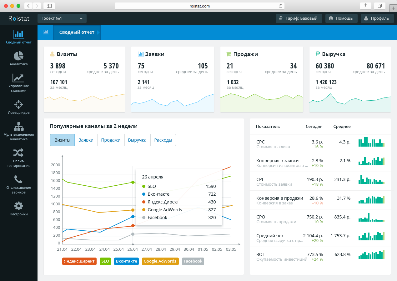 Roistat собирает данные из CRM Битрикс24, рекламных площадок и вашего сайта. Из этих данных он формирует отчеты по 22 ключевым бизнес-показателям: ROI, LTV, CAC, CPC, CPL, CPO, прибыль, конверсии, и др.