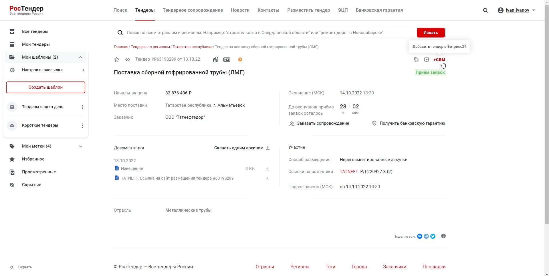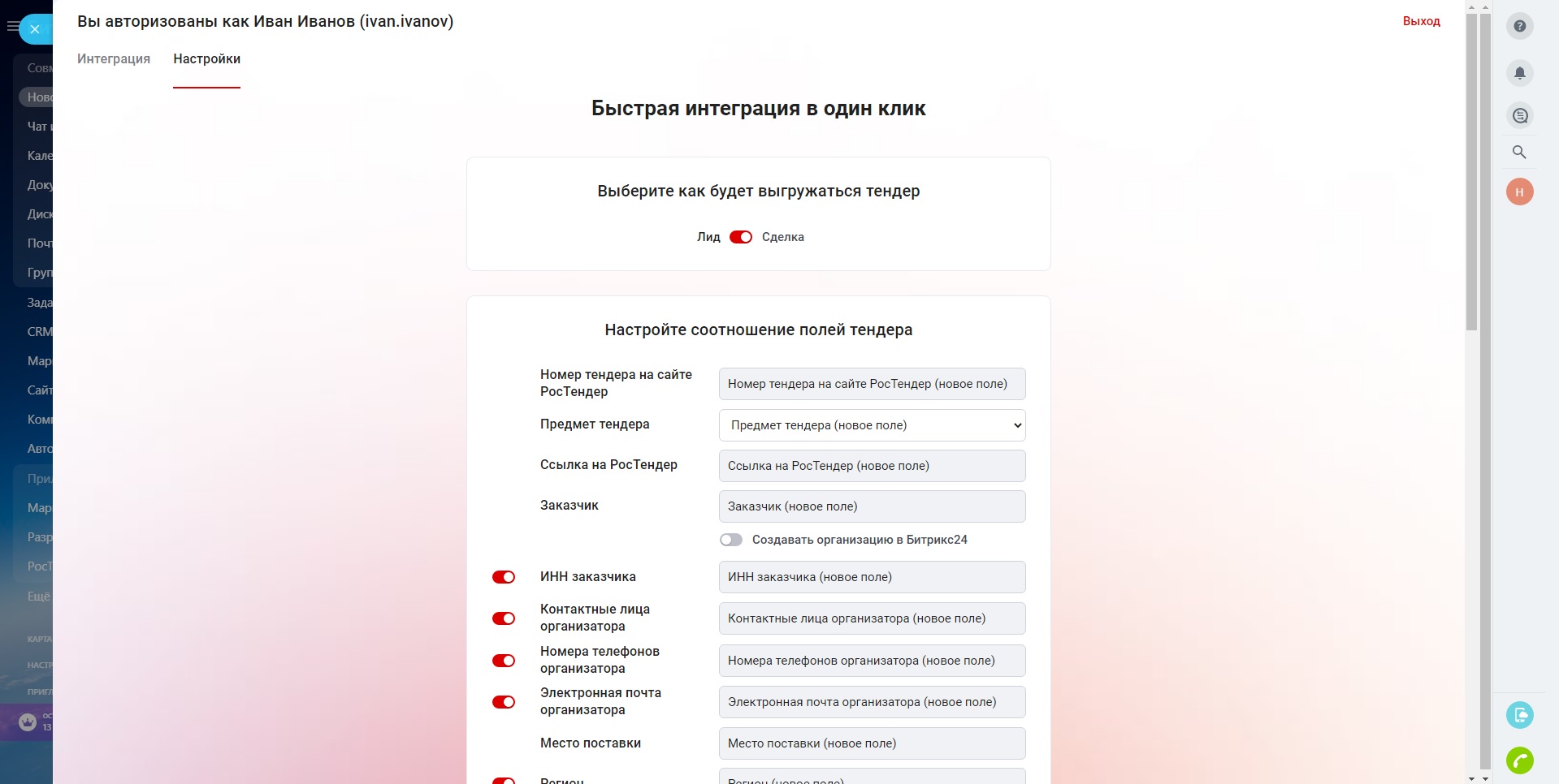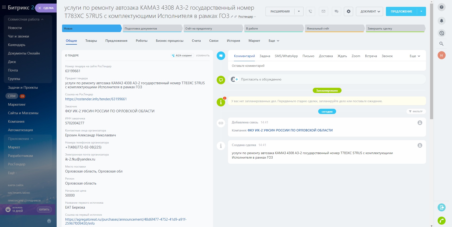 Все нужные закупки в вашем Битрикс24. Интеграция РосТендер с вашей CRM. Вся информация по тендеру выгружается в лид или сделку в один клик.