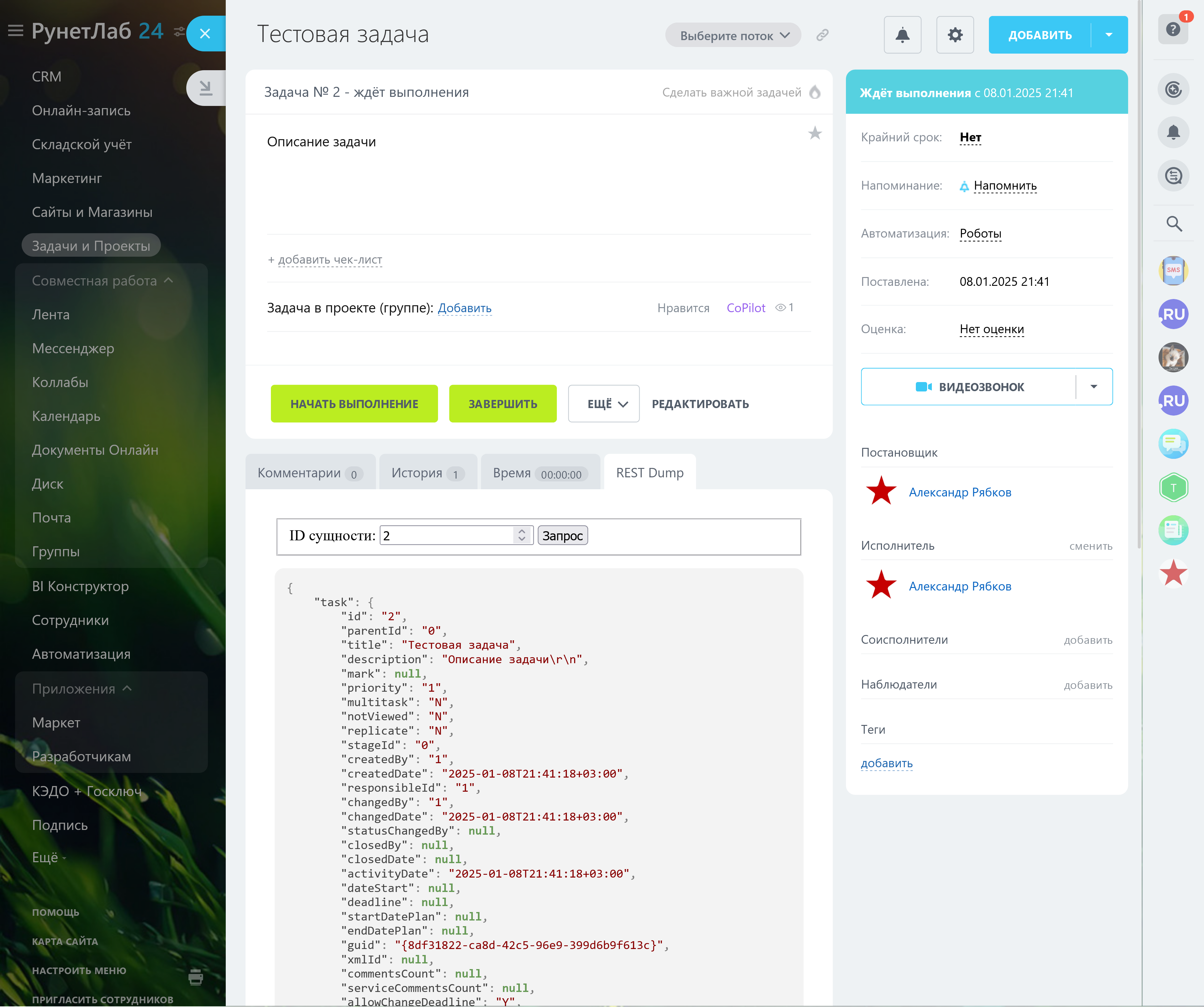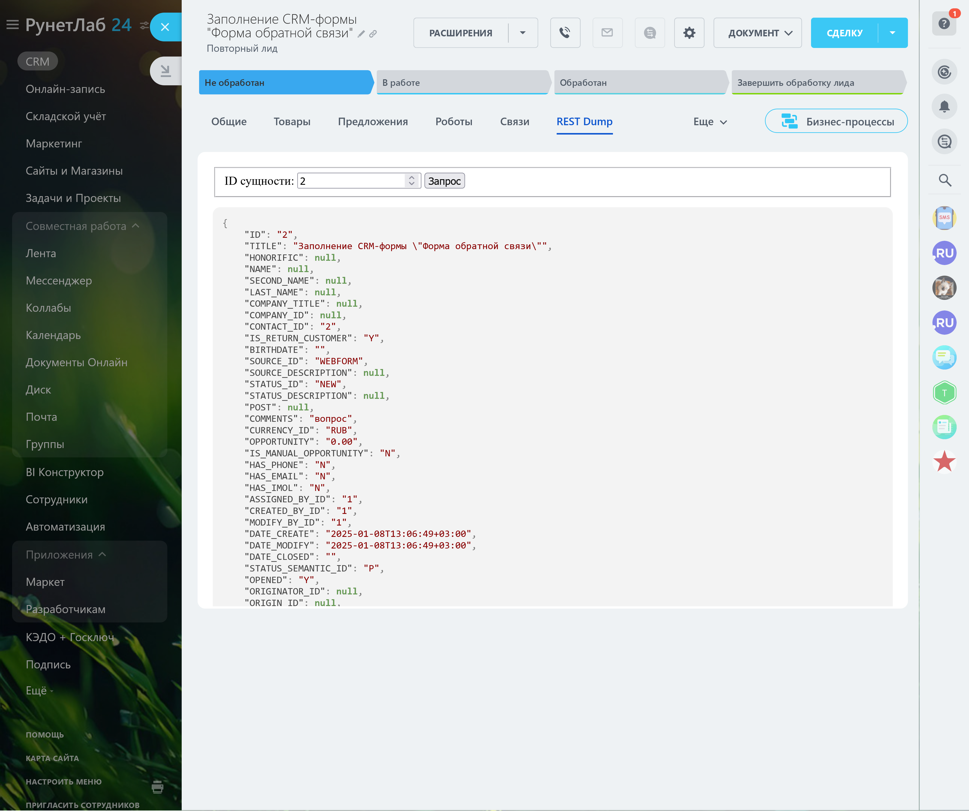 После установки приложения в лидах, сделках, контактах, компаниях и задачах появится вкладка "Rest Dump". При первичном открытии запрос происходит на удалённый сервер, при вводе ID сущности в форму - на JavaScript из браузера. Все запросы происходят с правами пользователя использующего приложение.
