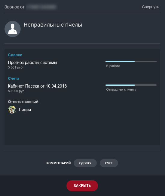 - уведомление о входящем звонке с именем клиента и историей сотрудничества;
