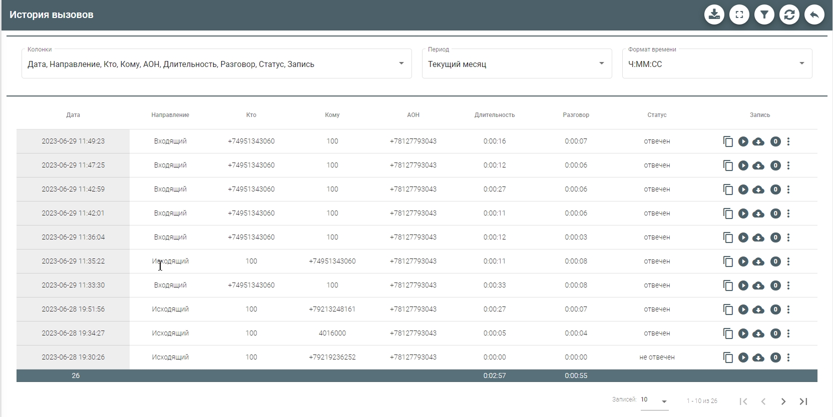 - Сохранение звонков в карточку клиента с возможностью их прослушивания.