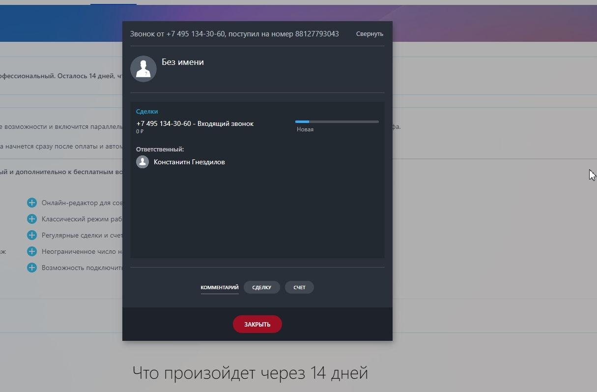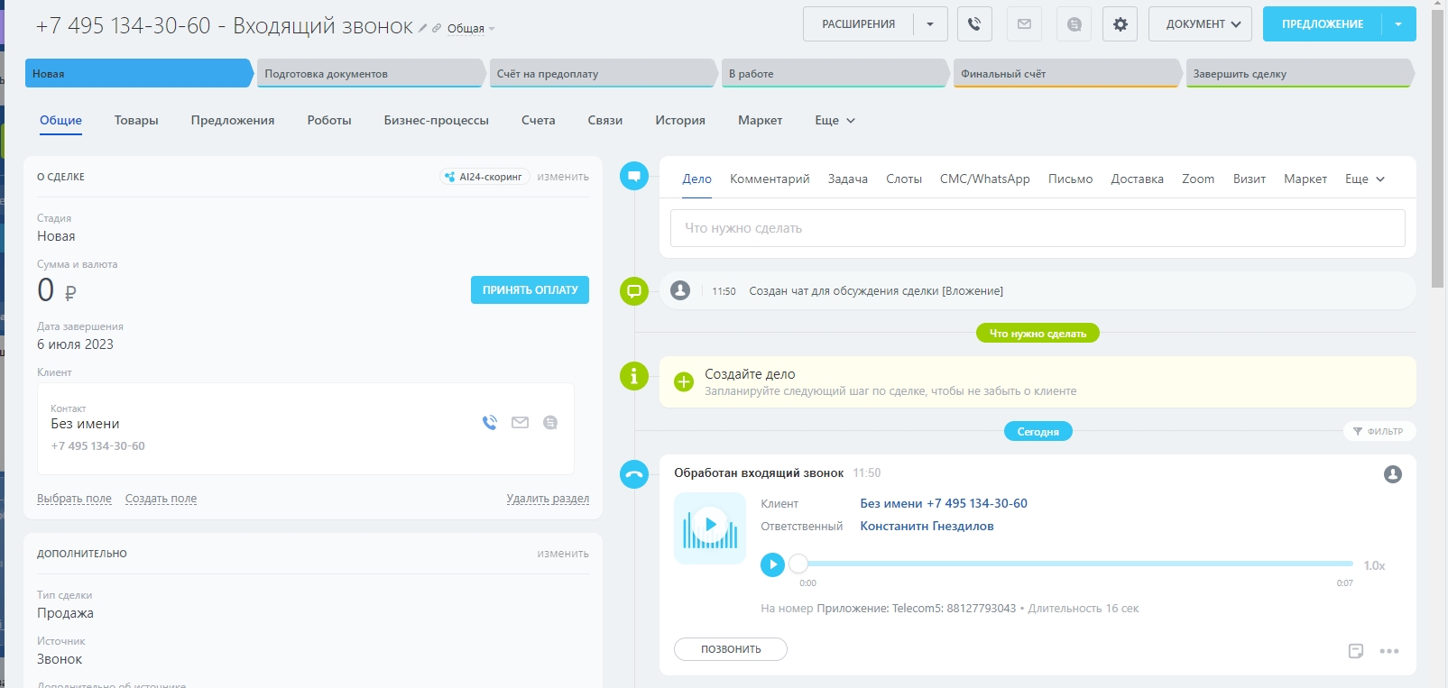 Подключив интеграцию с Виртуальной АТС от Telecom5, Вы получите: