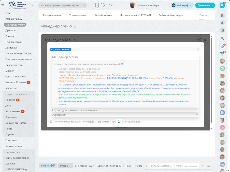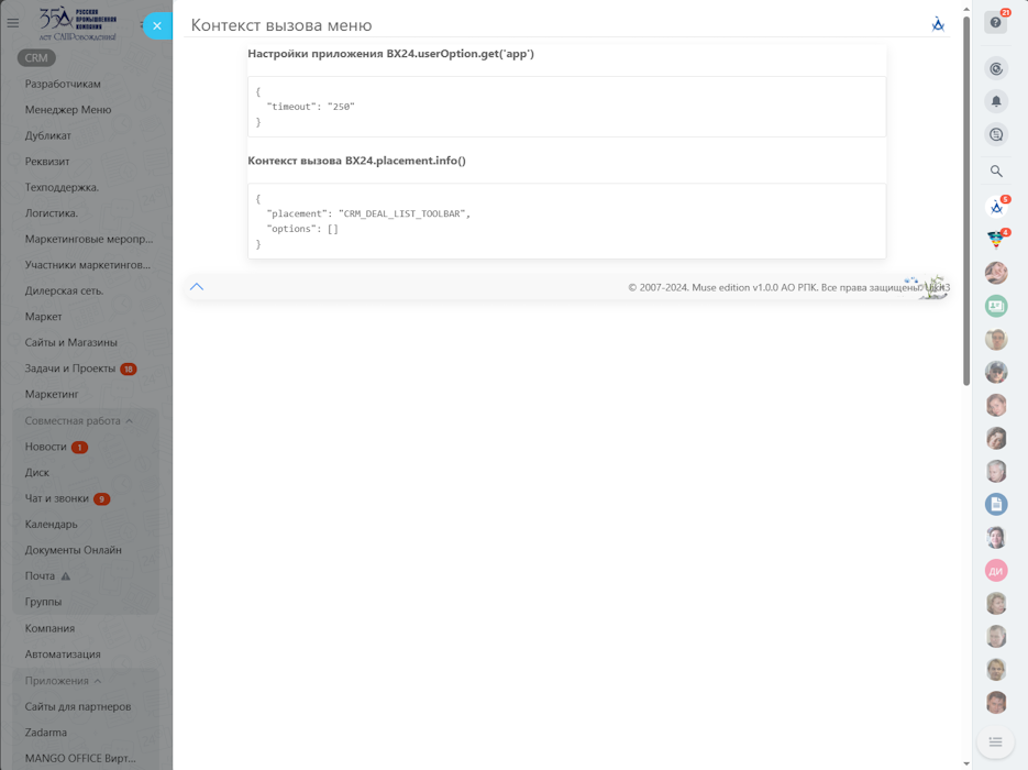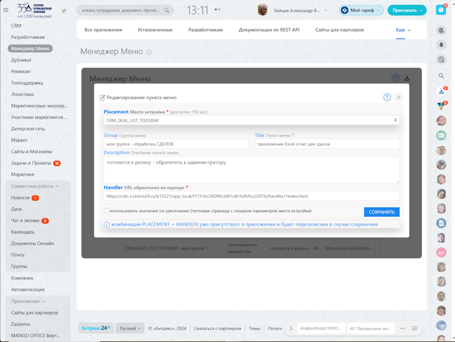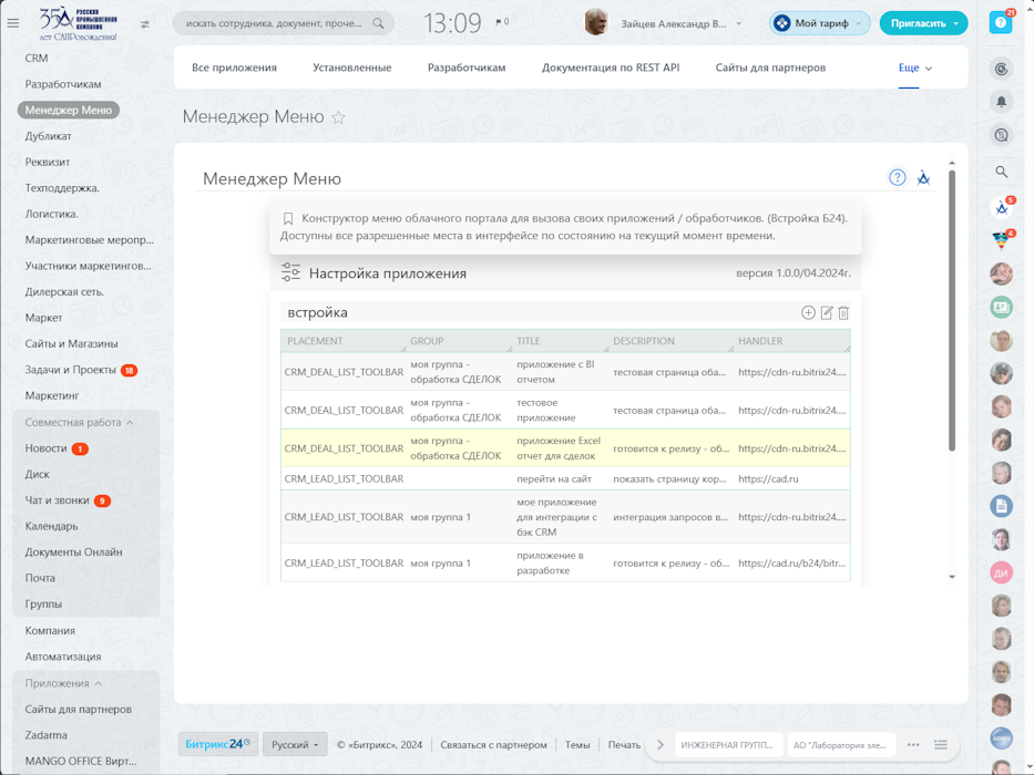 Конструктор меню облачного портала для вызова своих приложений / обработчиков. (Встройка Б24). Доступны все разрешенные места в интерфейсе по состоянию на текущий момент времени.