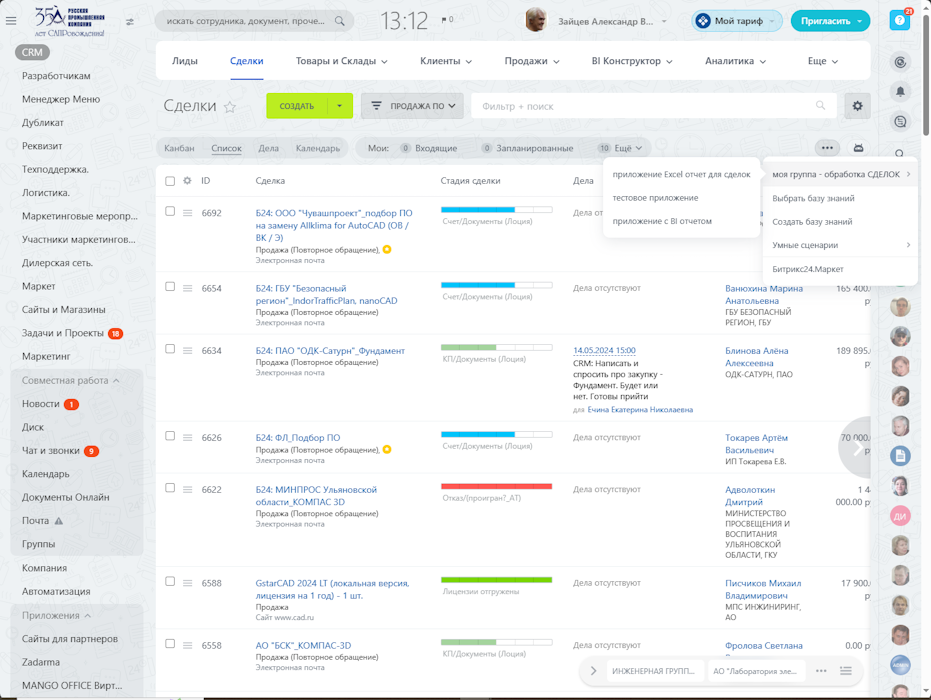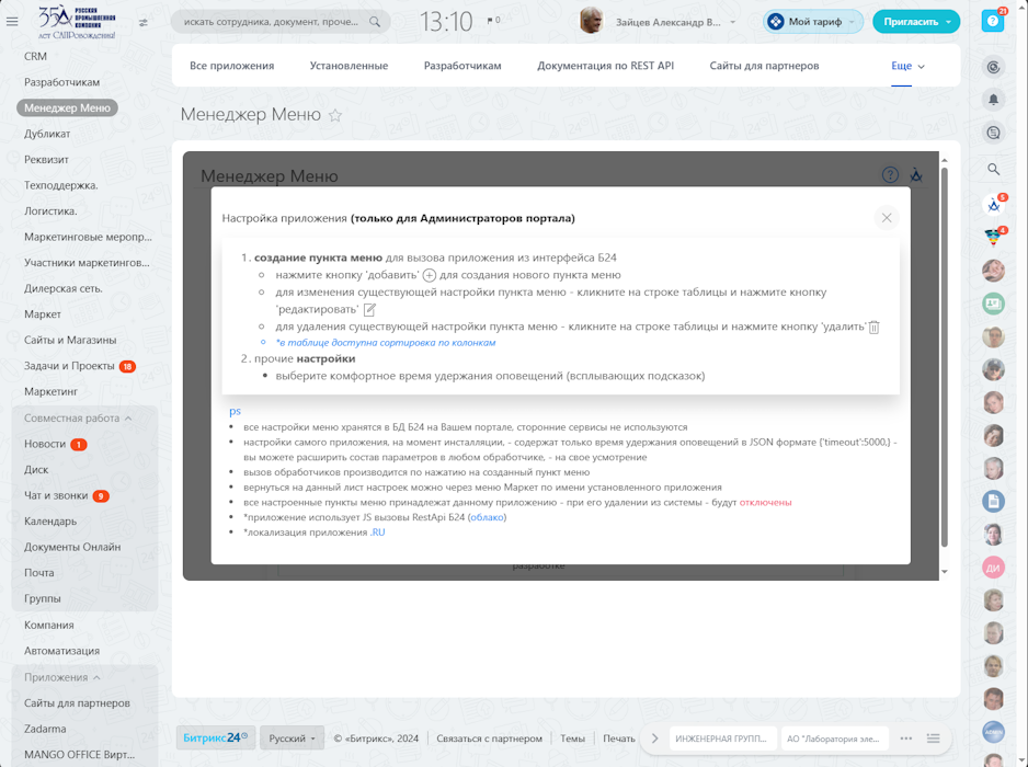 - визуальная настройка пользовательских меню Б24 в режиме одного окна, в рамках приложения