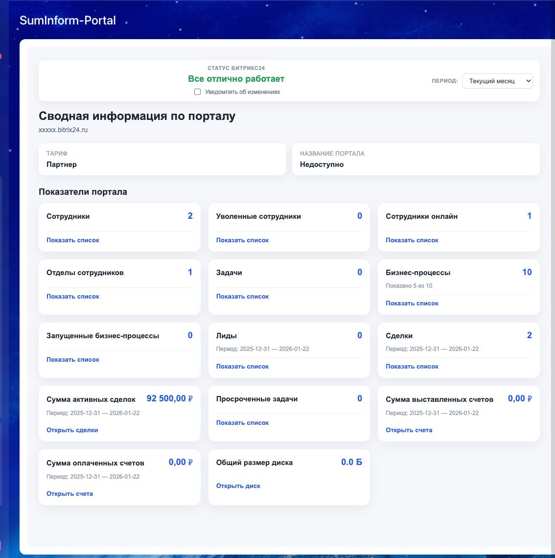 - На тарифах/порталах без CRM‑модуля CRM‑показатели будут недоступны (покажется «Недоступно»).