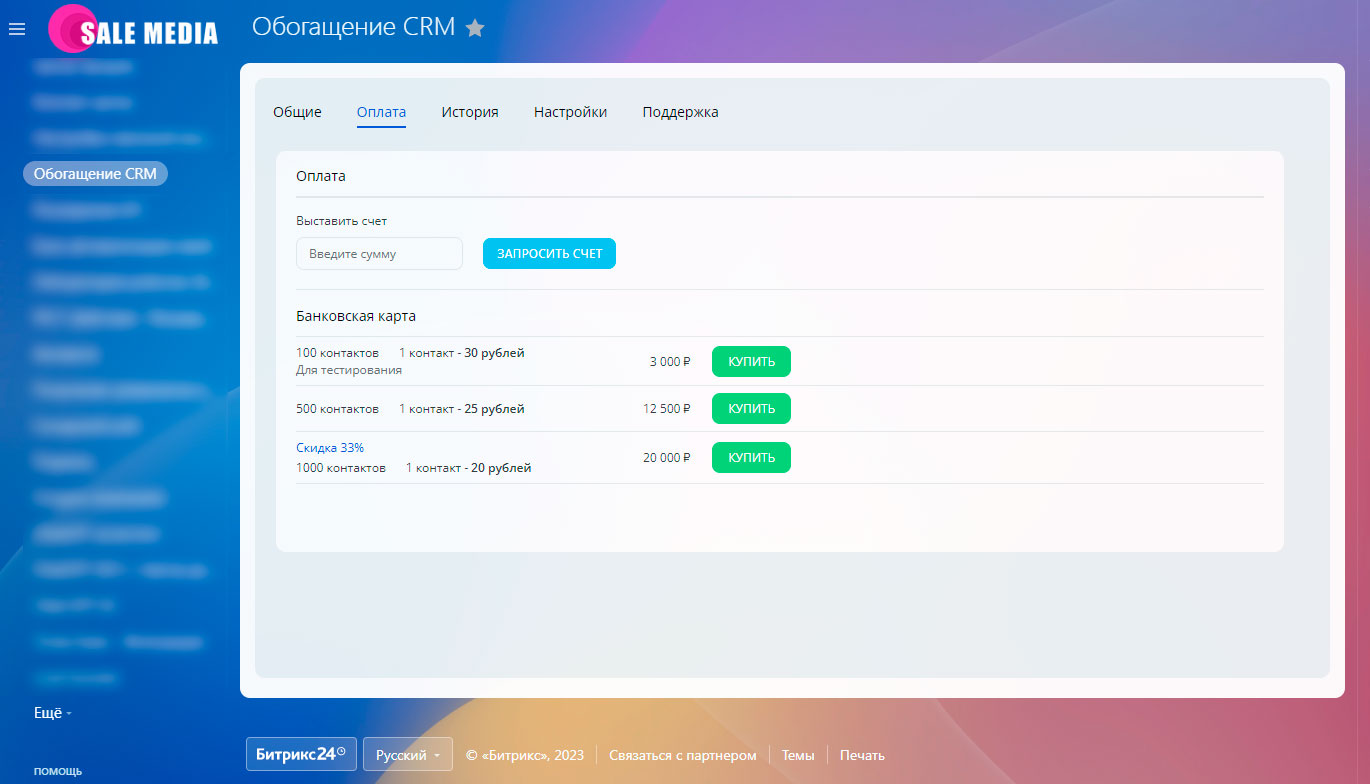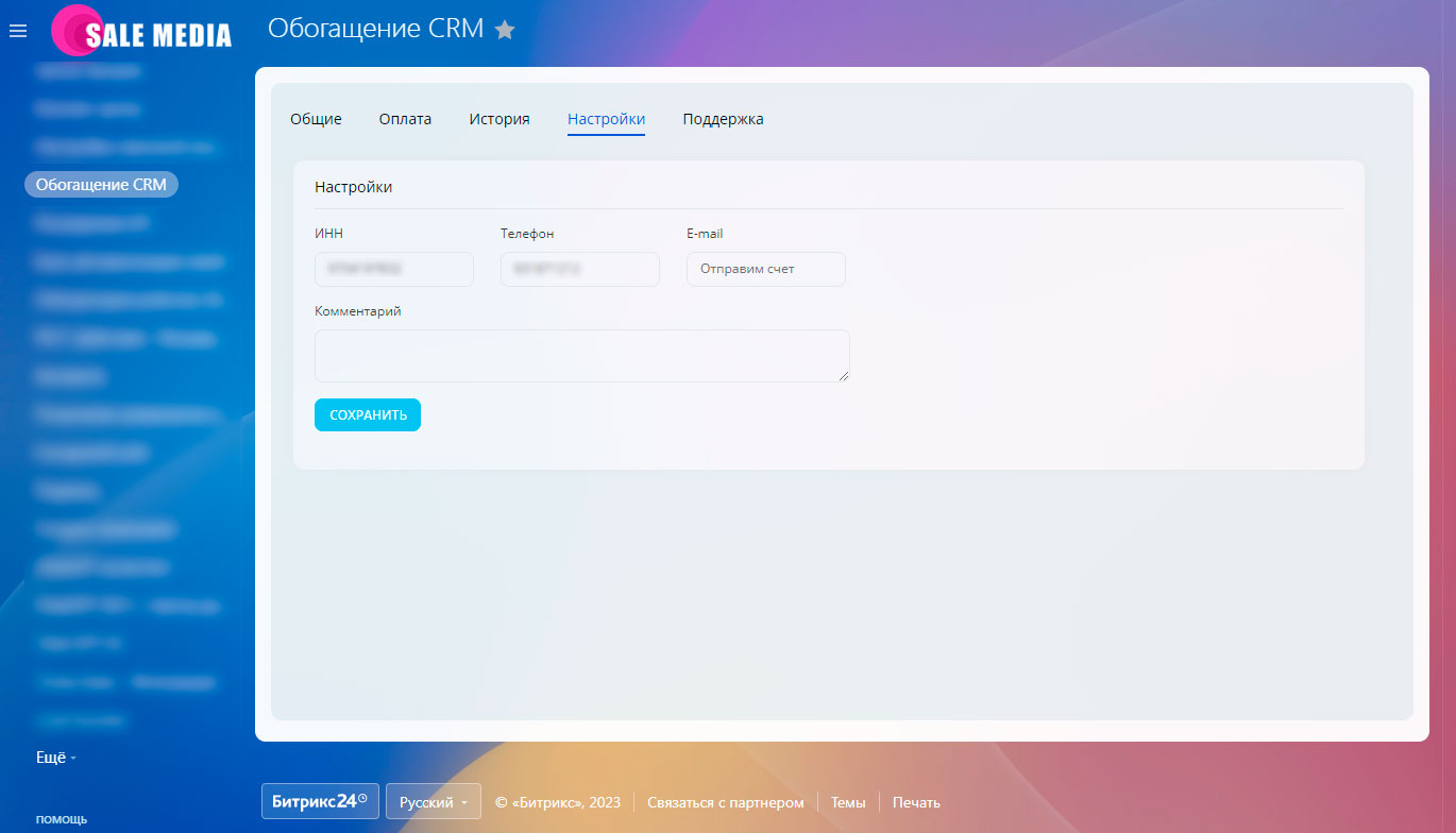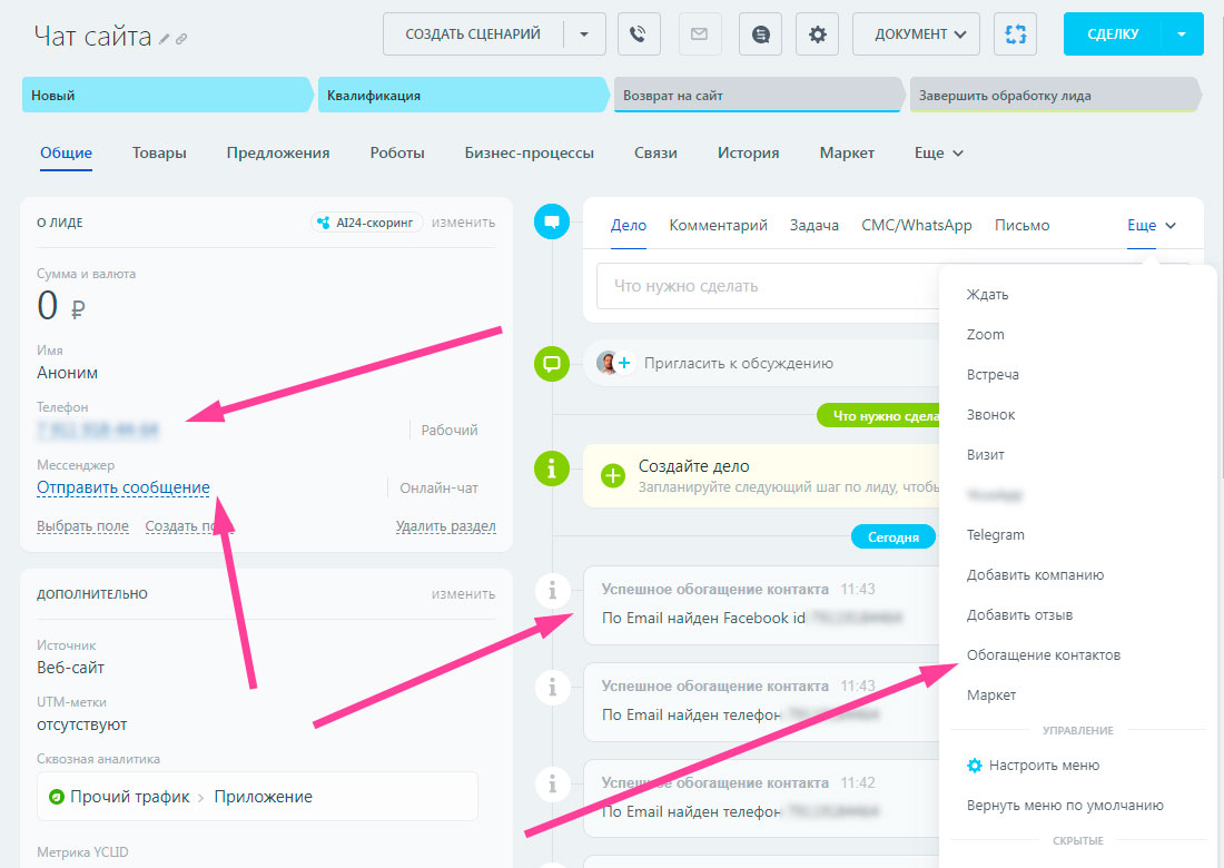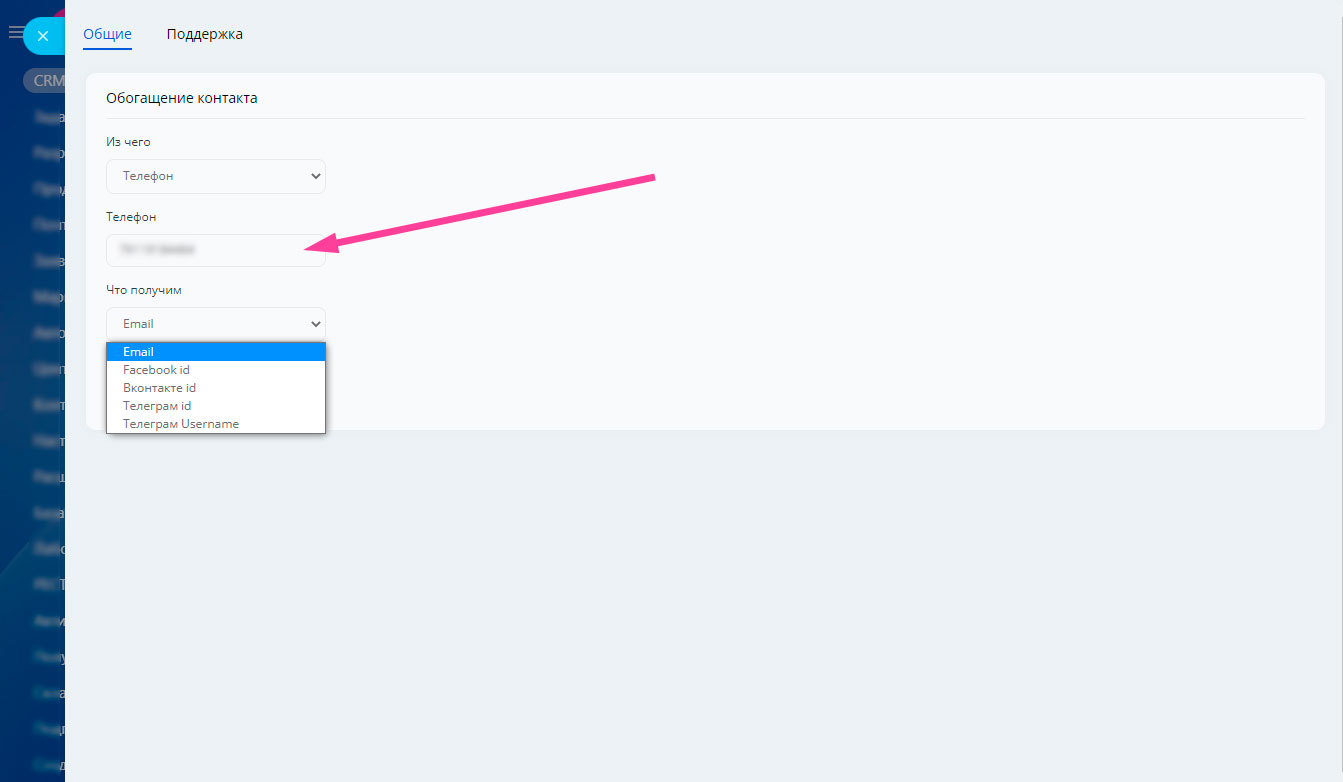 Обогащение CRM (дополнительные контакты - телефон, email, VK, Telegram)
