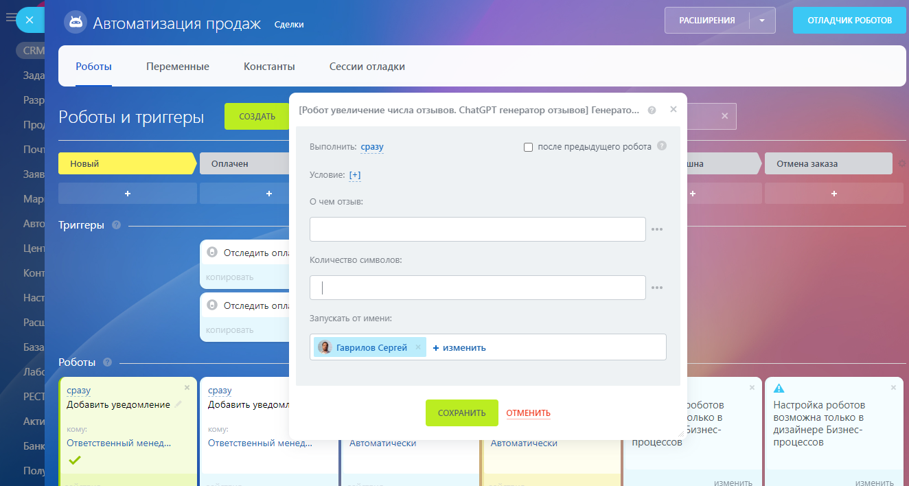 Приложение само сгенерирует отзыв за клиента на нужной вам стадии. Например, после перехода сделки в стадию успешной или сразу в момент создания сделки. Отзыв появится в вашей карточке сделке или лида. Готовый отзыв вы можете отправить сами. Или настроить робота, который будет отправлять сгенерированные отзывы на email или в мессенджеры клиентов, и, таким образом, полностью автоматизировать этот процесс.