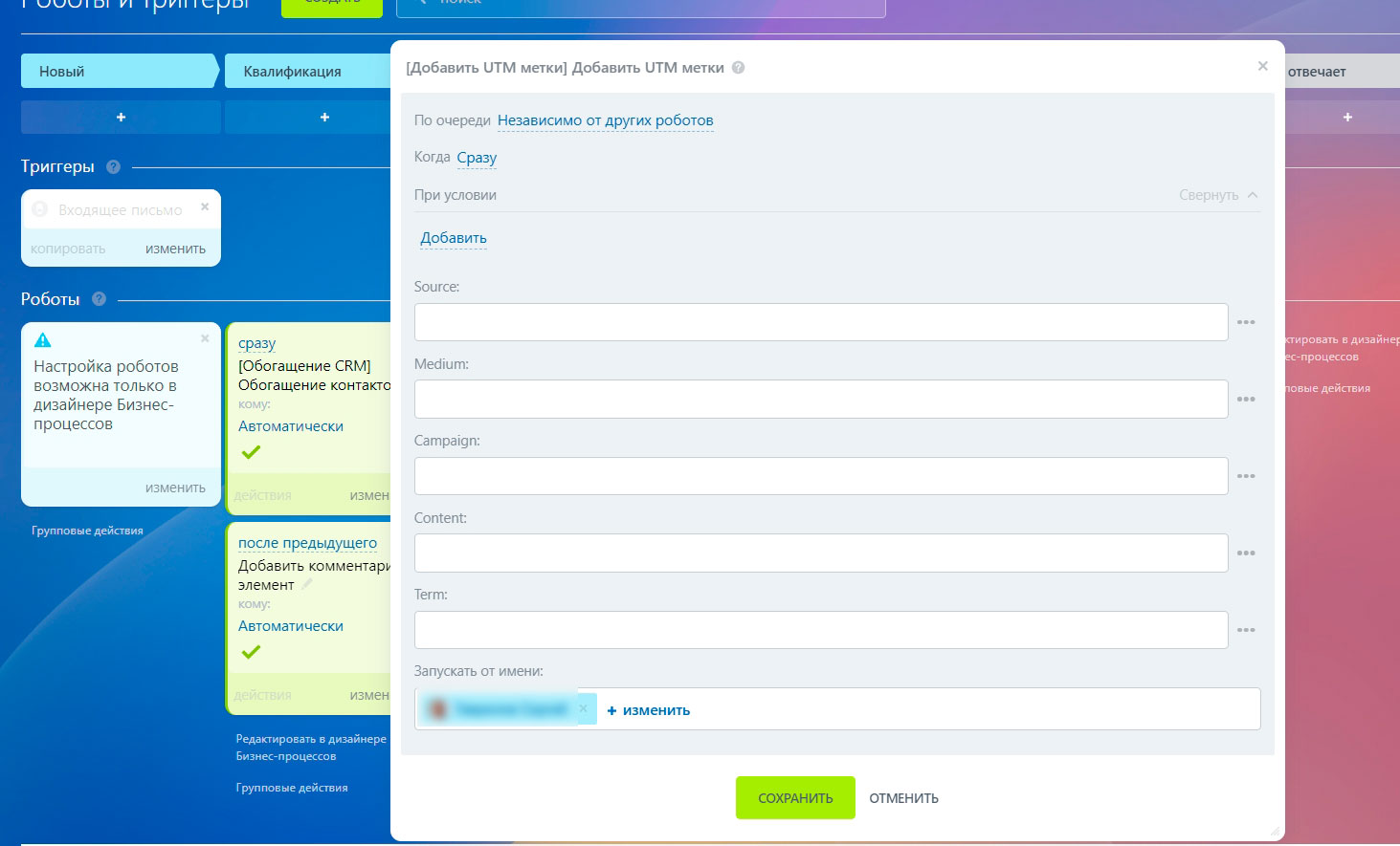 Добавление UTM меток к лидам и сделкам в автоматическом (роботы, бизнес-процессы) и ручном режиме. Для целей улучшения аналитики. Изменить или добавить UTM метки в Битрикс24 через web интерфейс нельзя.