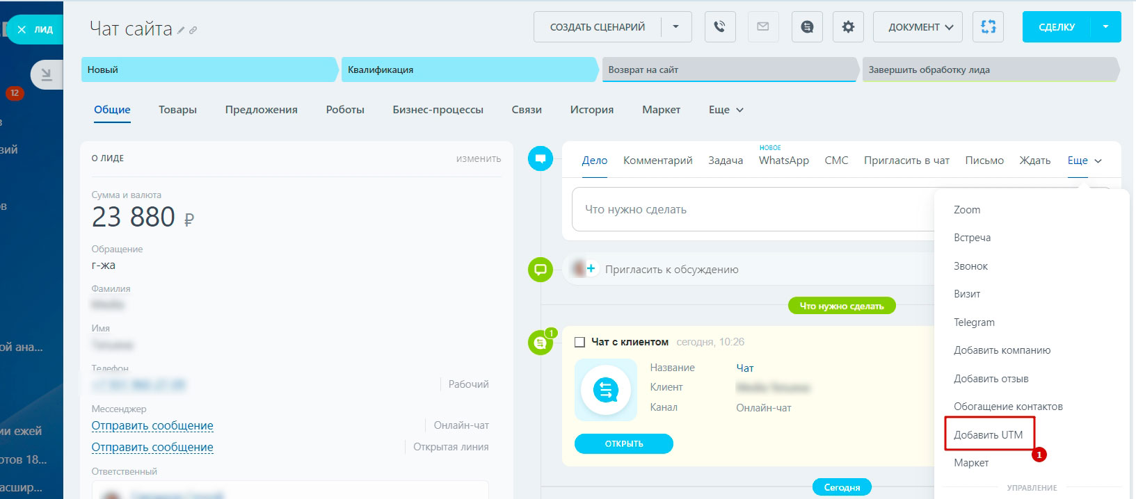 - Есть возможность добавить UTM метки к лиду из лида или к сделке из сделки. Для этого необходимо в меню таймлайна выбрать пункт "Добавить UTM" и ввести значения в нужные поля.