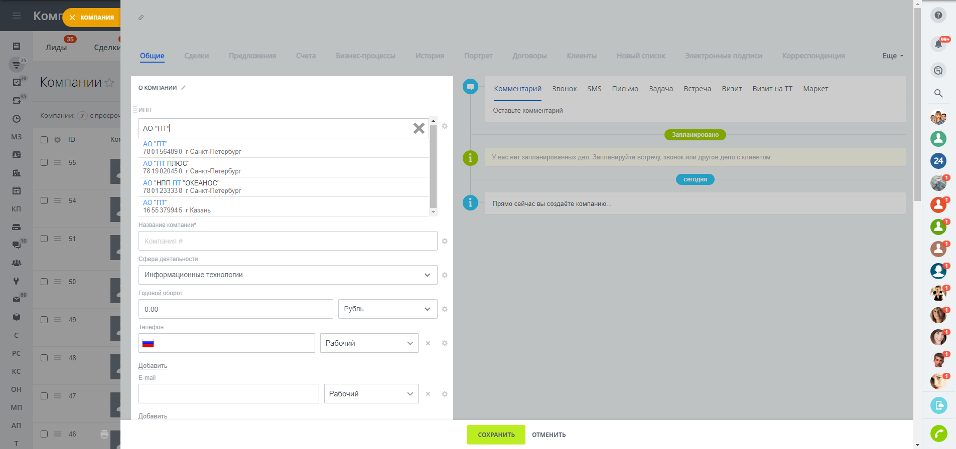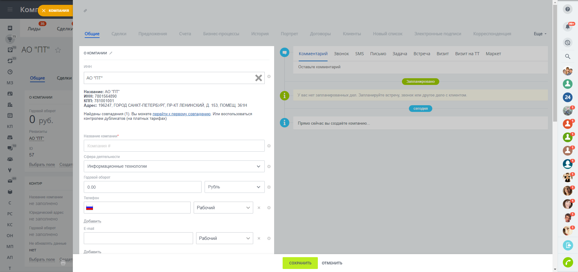 Если в Вашей CRM уже есть компания с таким ИНН, то будет предложено к ней перейти, не создавая дубль.
