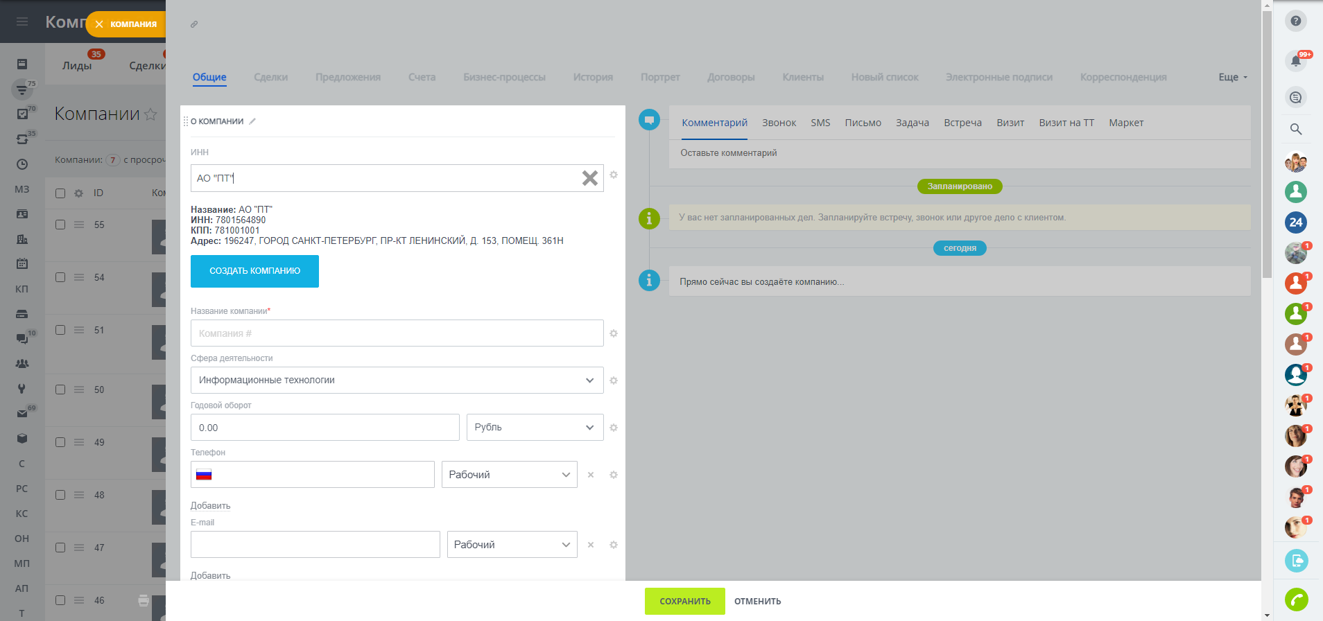 Если найдена компания, то можно нажатием на кнопку "Создать компанию" автоматически создать карточку компании, в которой будут заполнены: