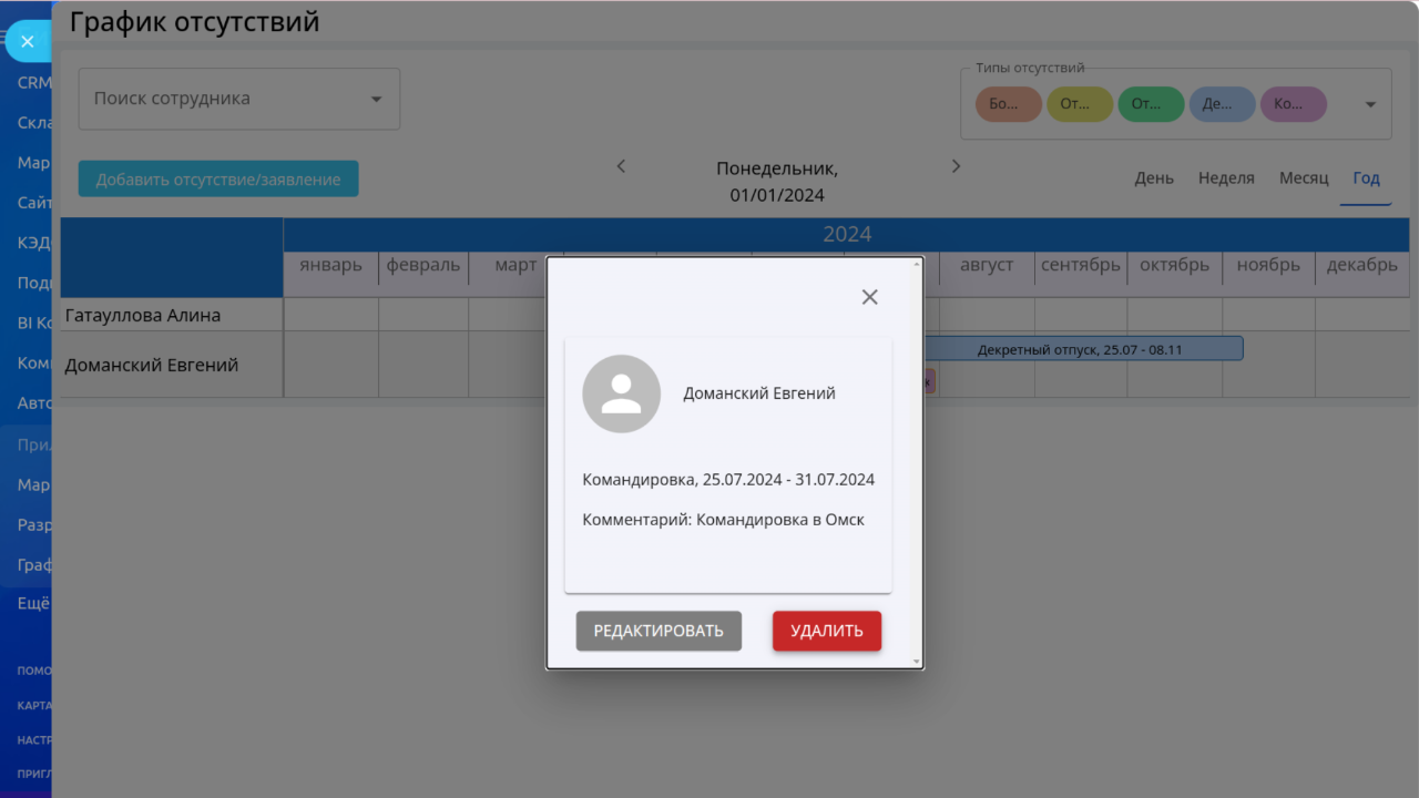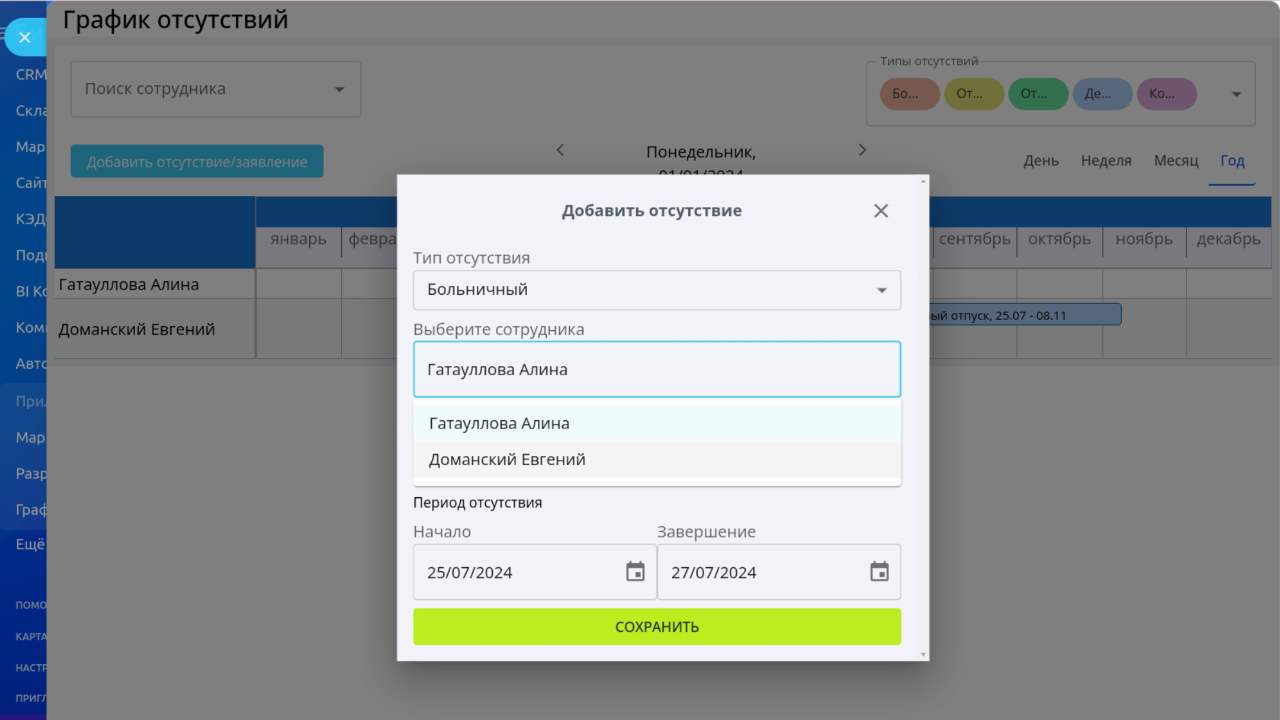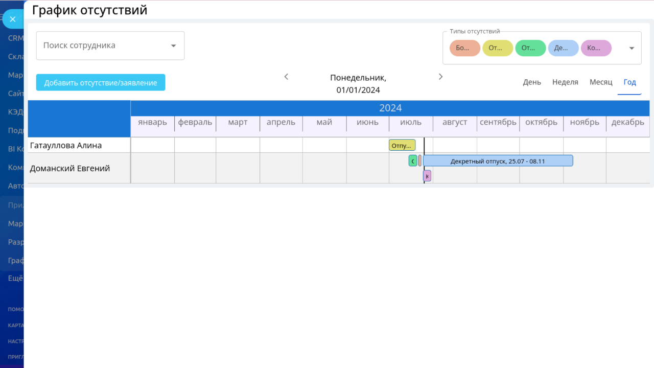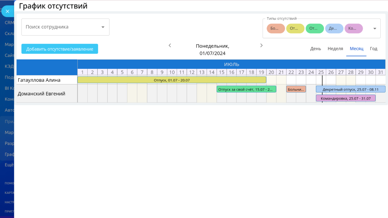 • Заявки на отсутствие - сотрудники подают заявки на отсутствие с указанием даты, типа и причины.