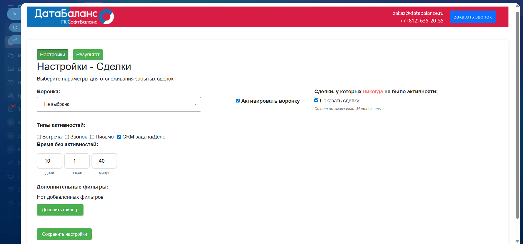 2) Укажите типы активностей (встреча, звонок, письмо, задача, дело). Отметьте, нужно ли показывать сделки, в которых активностей нет вообще;