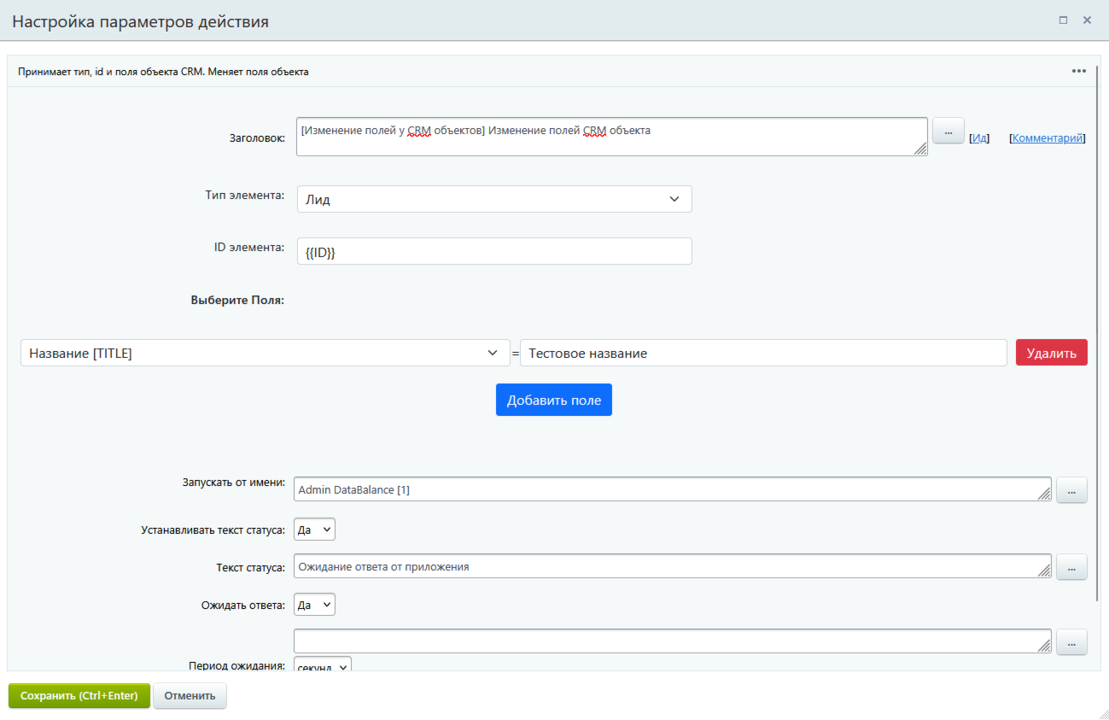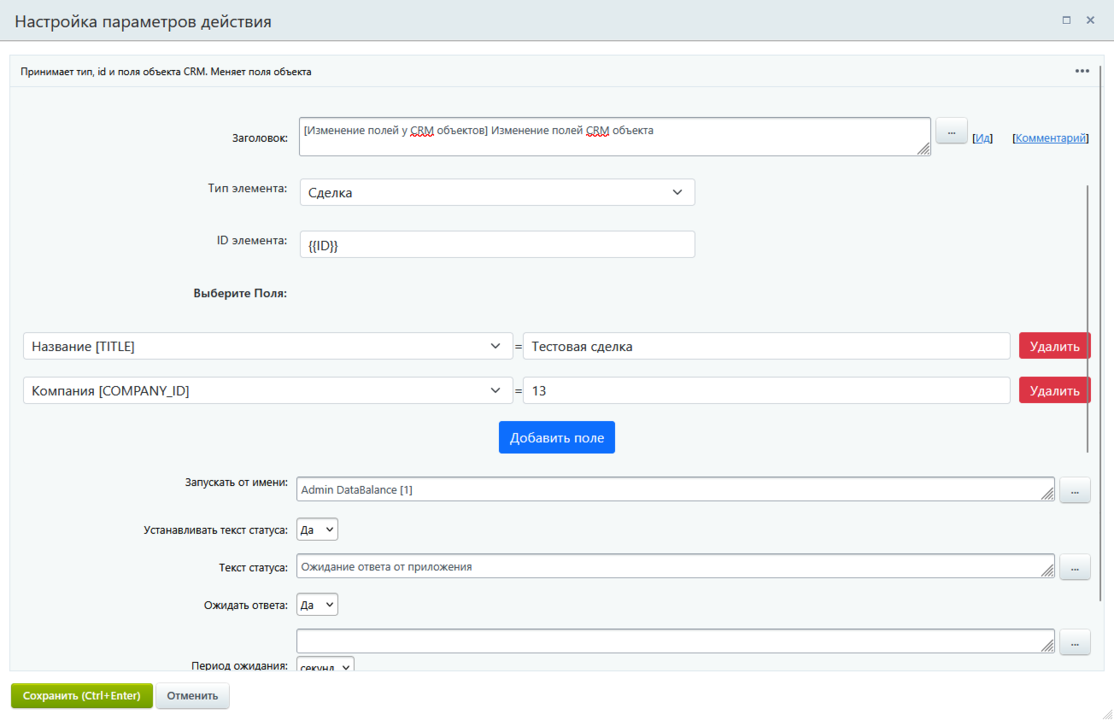 2) В настройках активити выберите необходимый тип элемента CRM, ID элемента, выберите и заполните поля (при необходимости можно выбрать несколько).