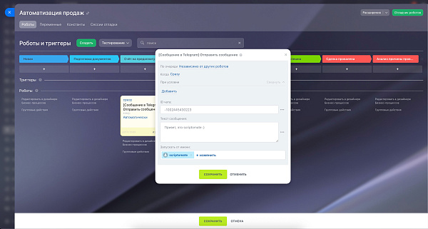 - Поддержка шаблонов для динамических сообщений (например, данные из сделки).