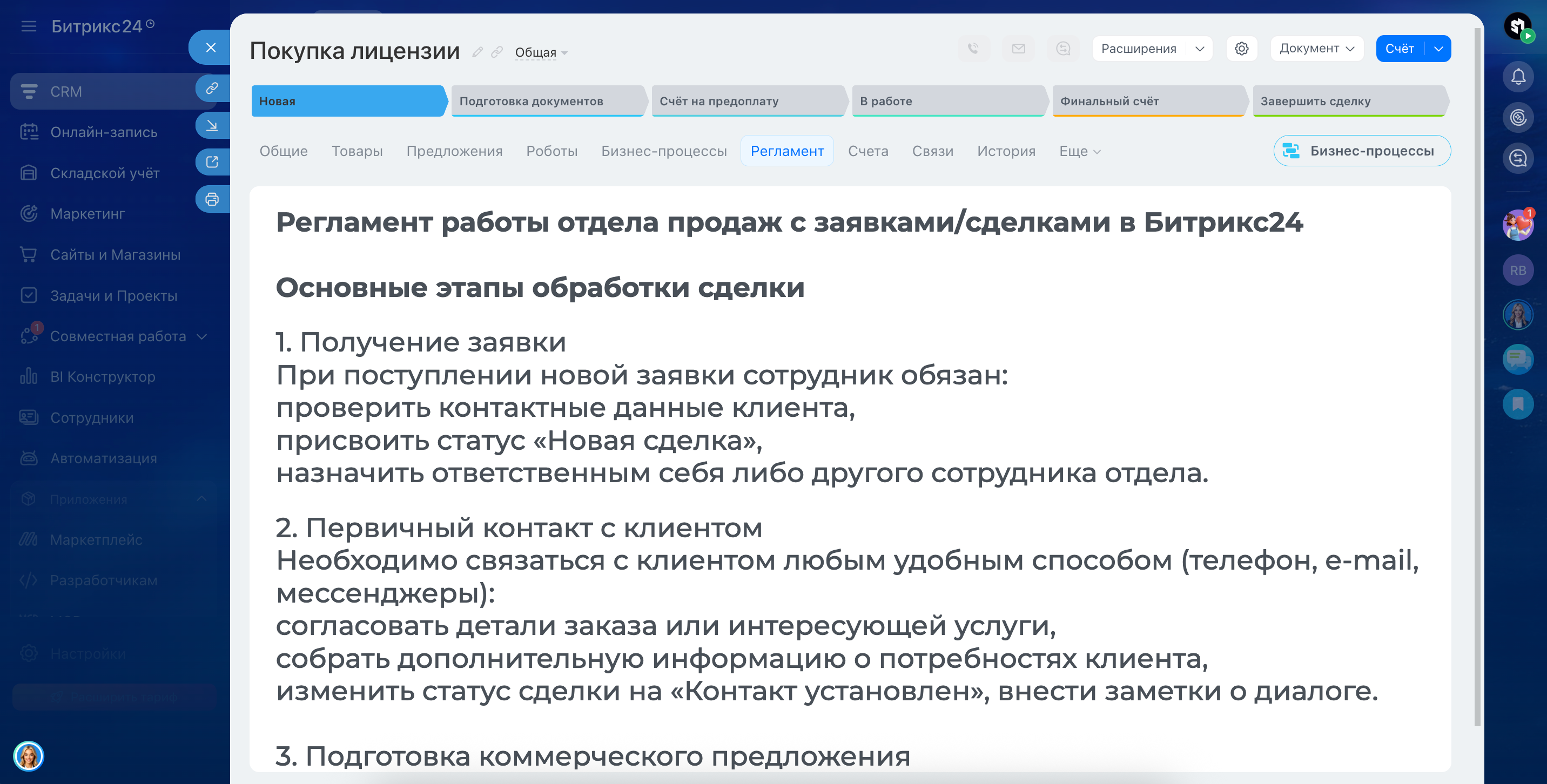 Менеджеру отдела продаж необходимо оформить сделку согласно установленным стандартам компании. Открыв карточку сделки, менеджер видит встроенный регламент, содержащий инструкцию по заполнению всех необходимых полей, оформлению документов и дальнейшим действиям после заключения договора