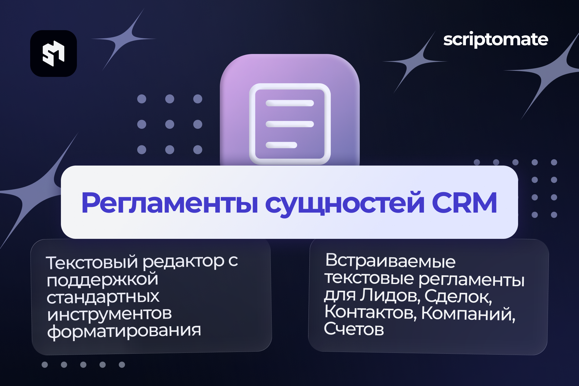 - Возможность добавления уникальных инструкций и рекомендаций для каждой отдельной сущности CRM