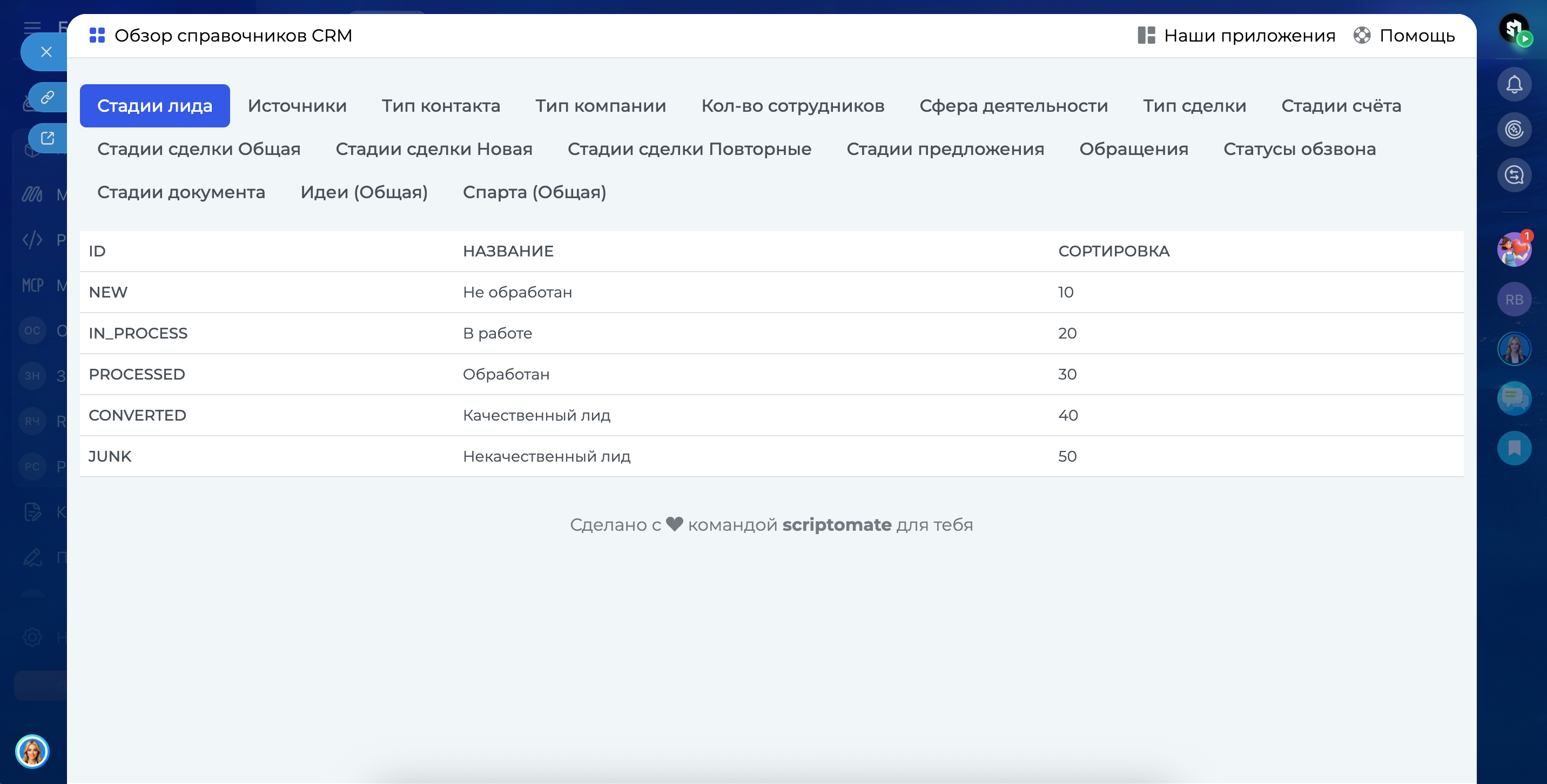 Простое приложение для Битрикс24, позволяющее быстро получать доступ ко всей технической информации справочников. Удобный инструмент для тех, кому необходима детализированная информация, такая как ID, названия элементов и сортировка
