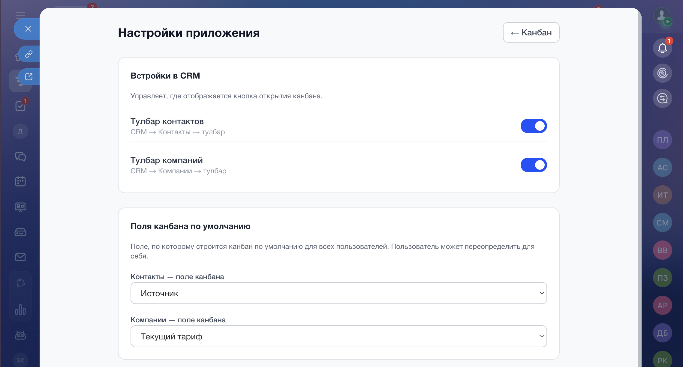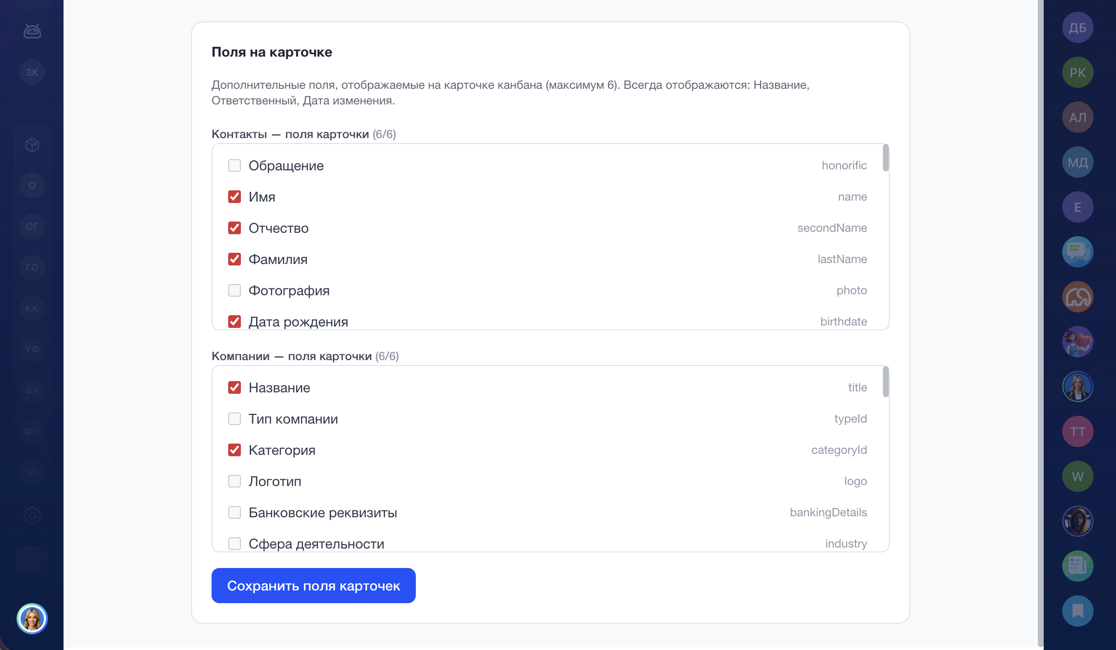 Персонализация рабочего пространстваКаждый менеджер может настроить внешний вид карточек под свои нужды, выбрав до 5 наиболее важных полей для отображения. Встроенные вкладки фильтрации позволяют сотрудникам в один клик переключаться между общим списком контактов и только теми сущностями, где они являются ответственными.