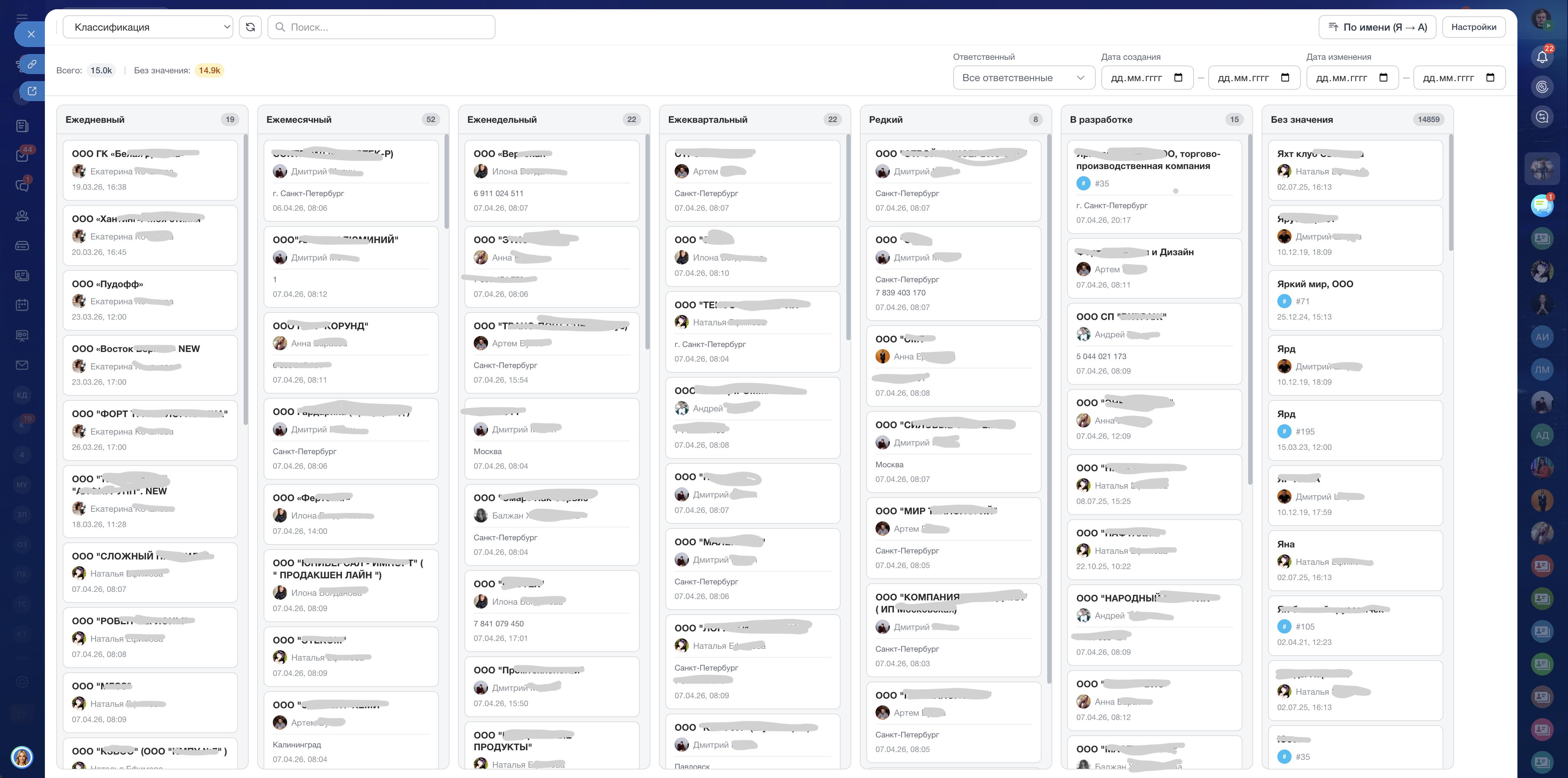 Мониторинг активностиИспользуя панель фильтров по дате последней активности или дате обновления, сотрудники могут быстро находить клиентов, с которыми давно не было связи. Индикатор KPI «Изменены за 7 дней» позволяет отслеживать динамику работы с базой и актуальность данных.