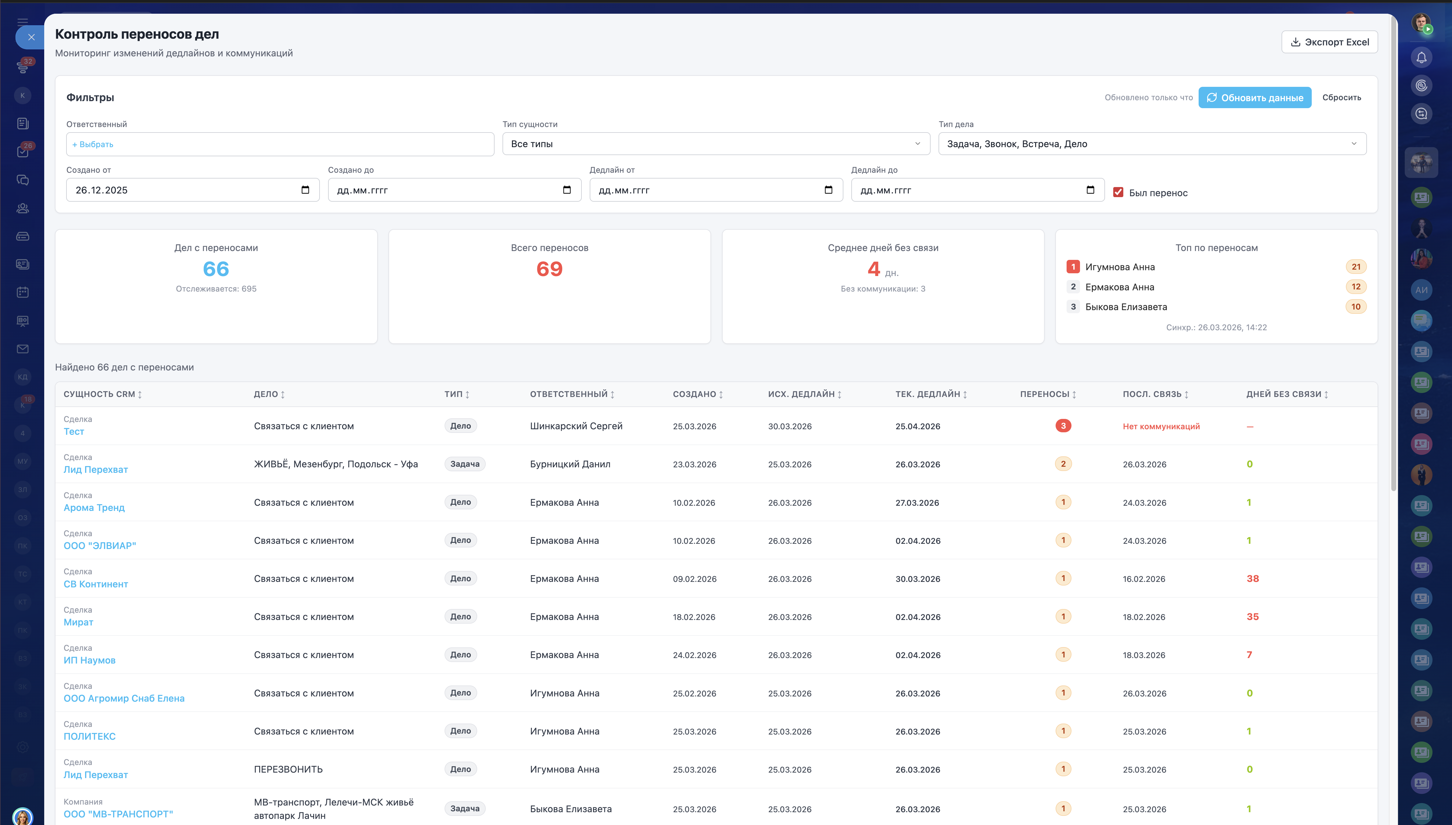 Подробная таблицаВсе дела с переносами в одной таблице: сущность CRM, ответственный, исходный и текущий дедлайн, количество переносов.