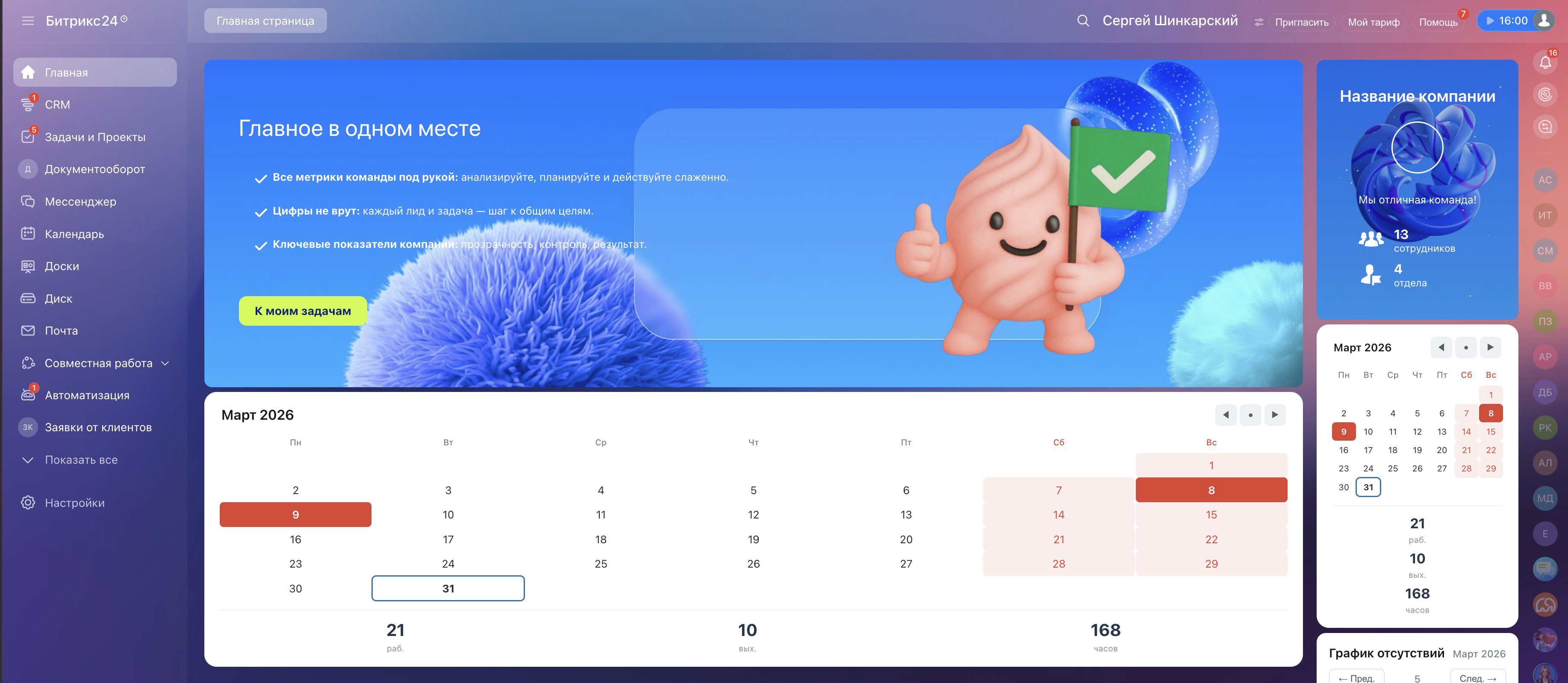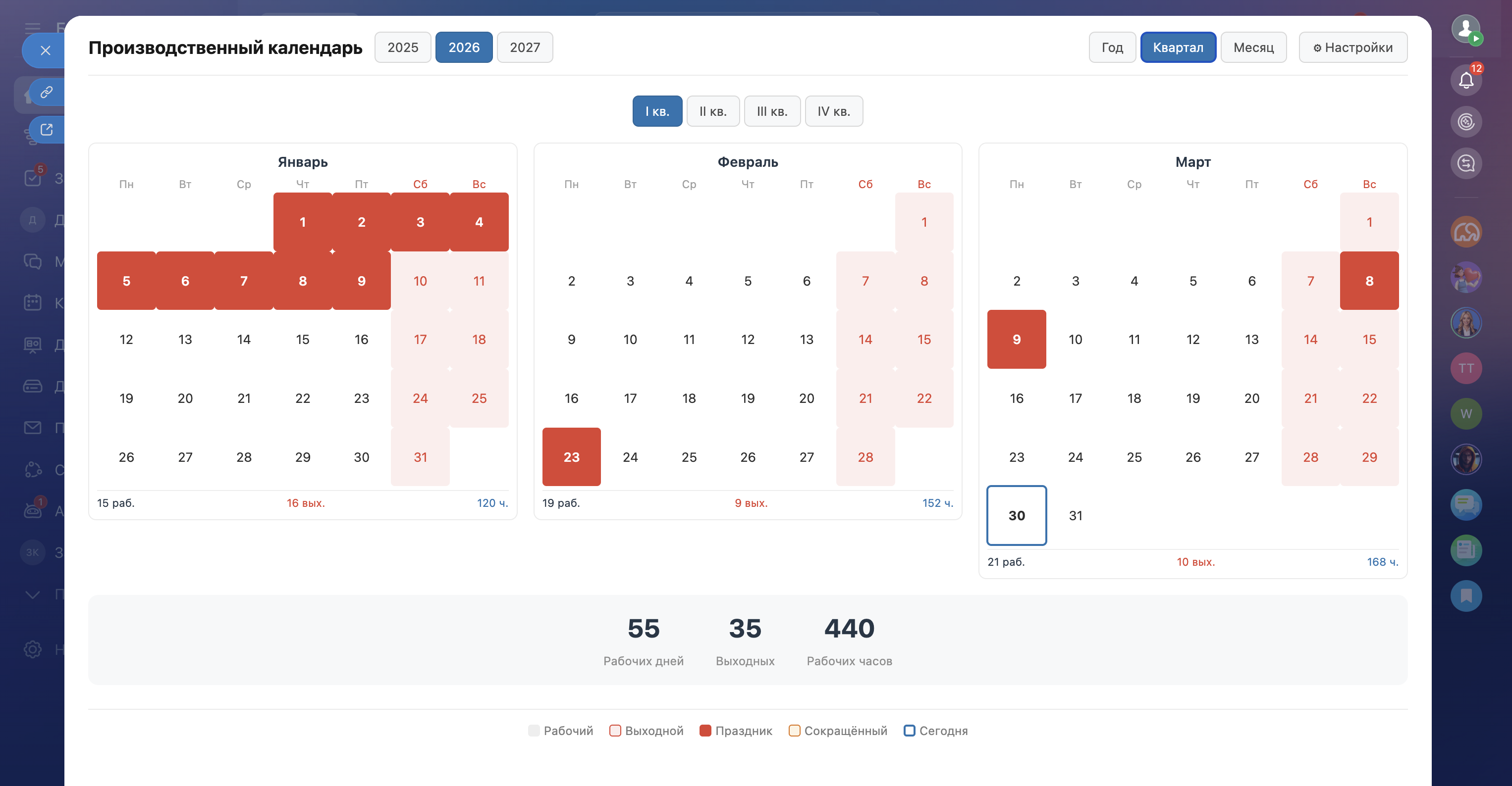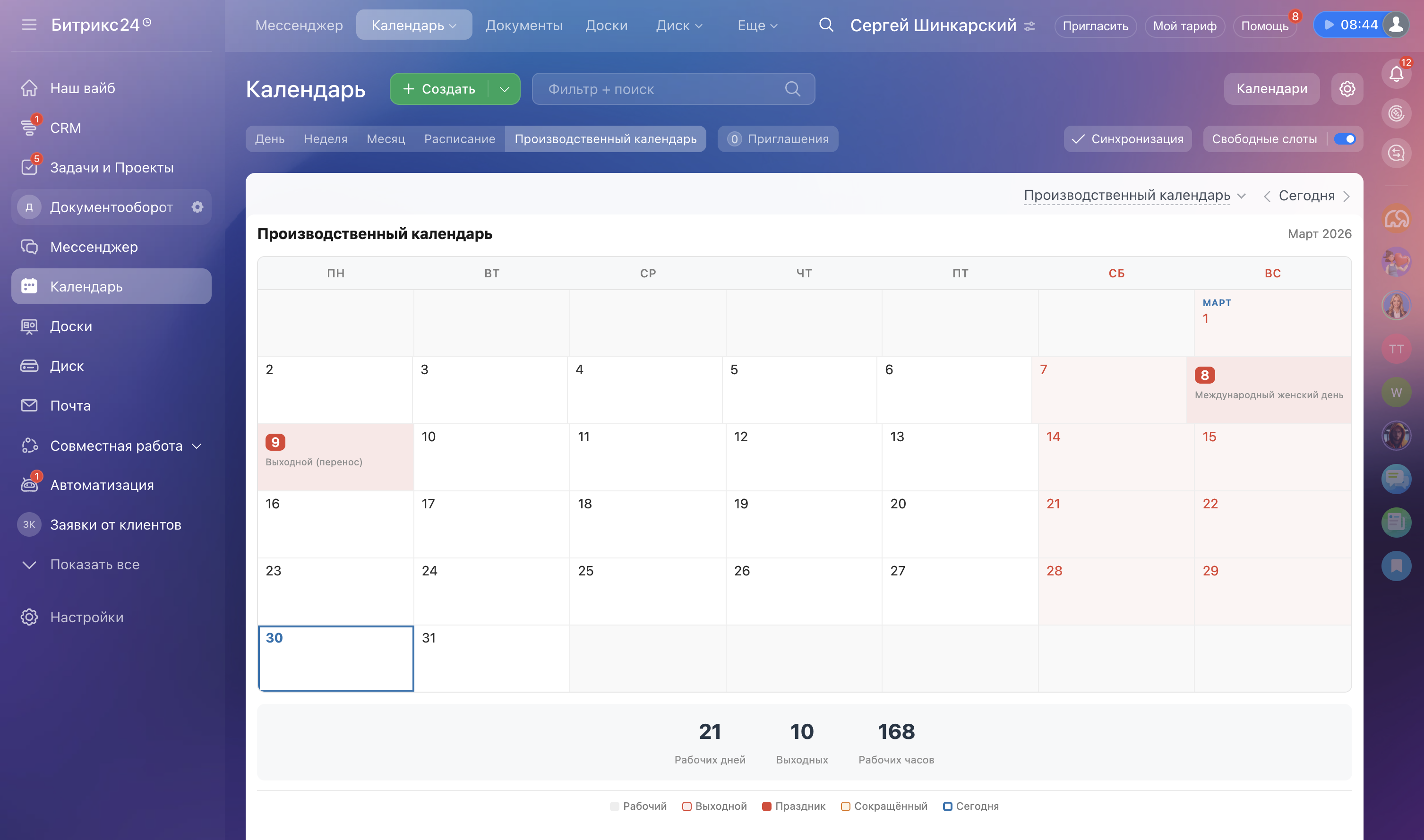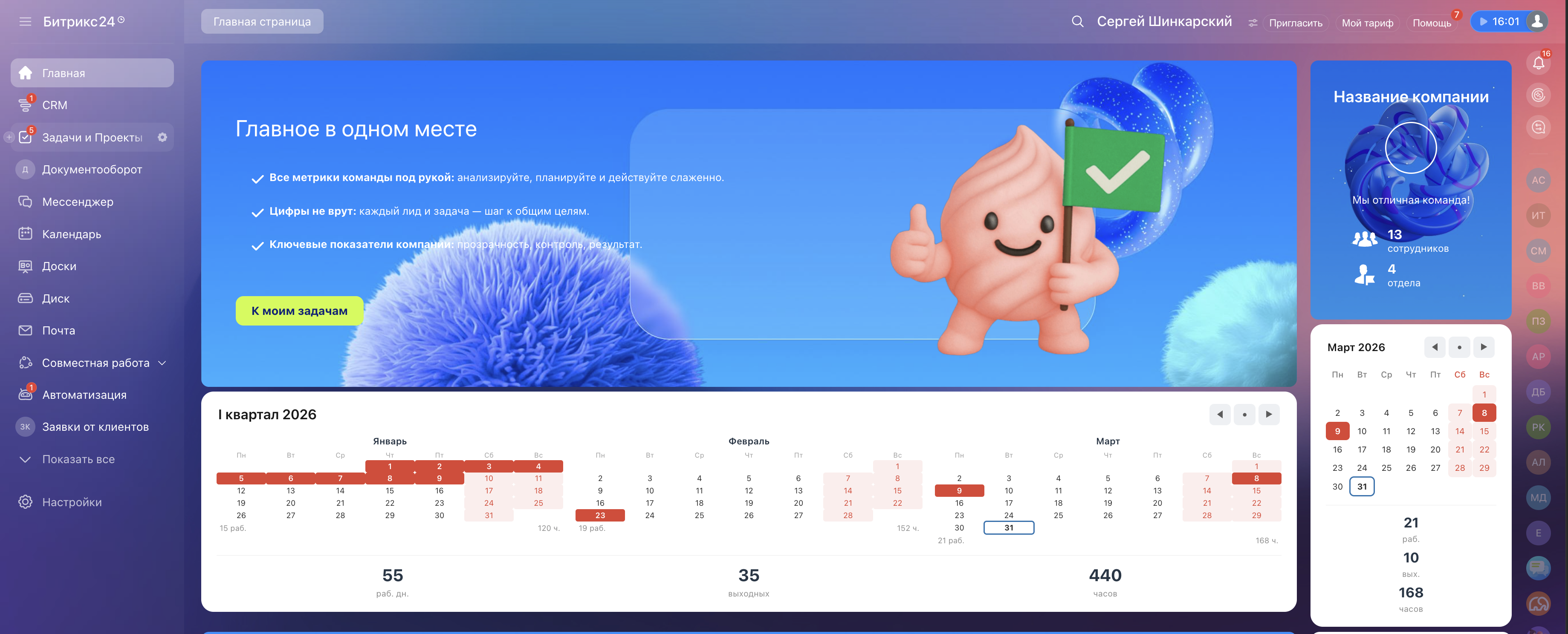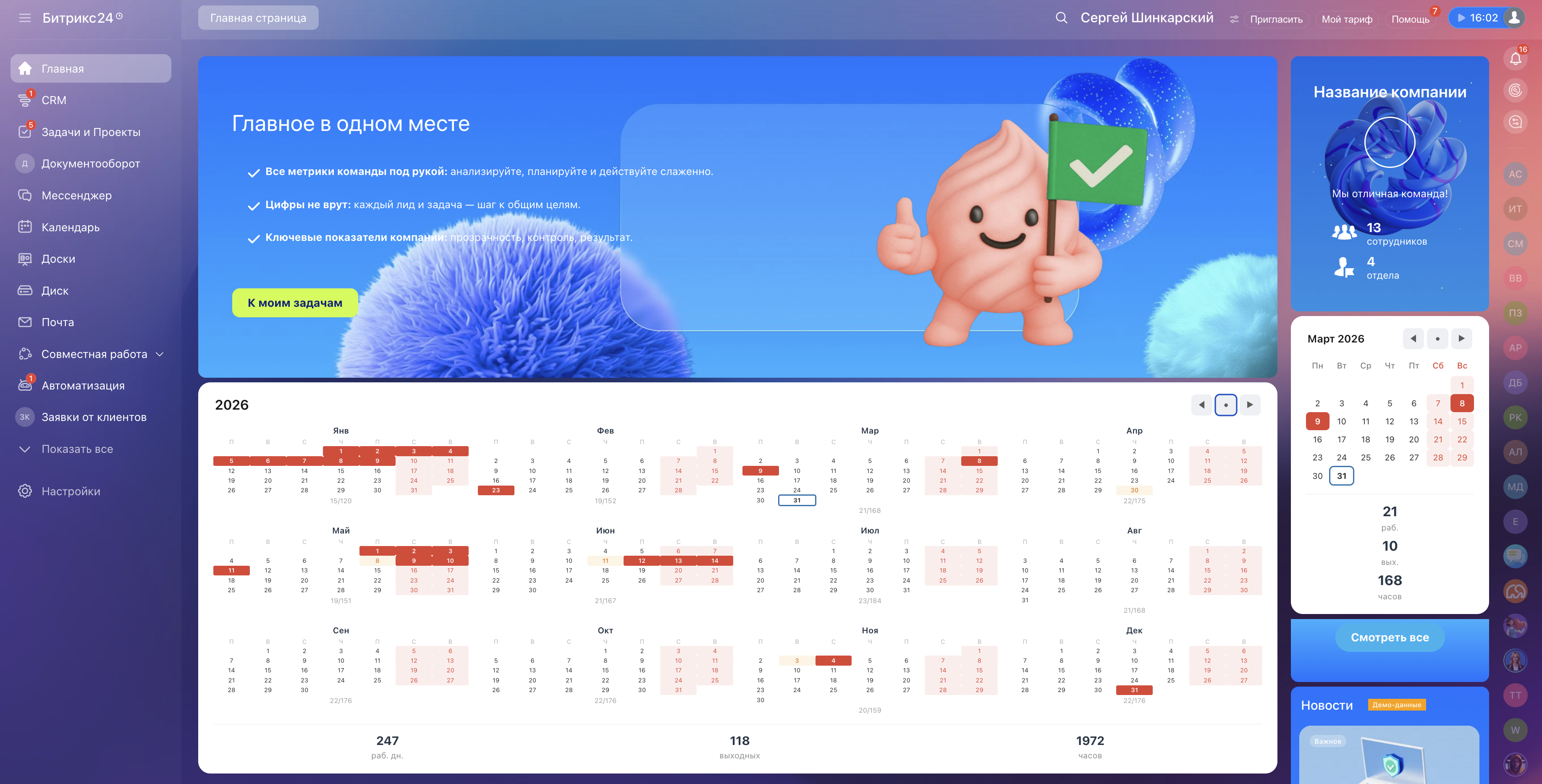 Не нужно открывать Консультант, Гарант, или другие сайты. Производственный календарь доступен на главной странице — первое, что видит сотрудник при входе в Битрикс24.