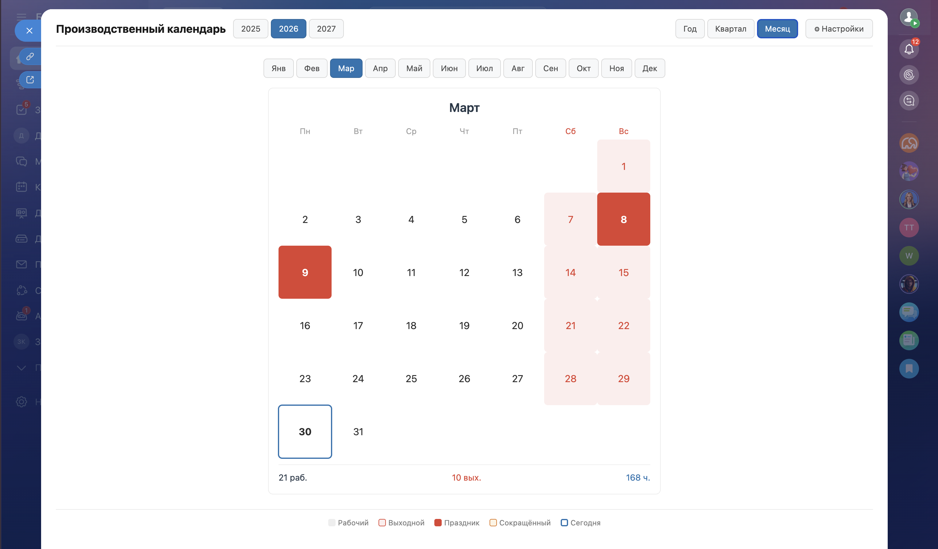 Бухгалтерия и кадровый отдел могут сверять нормы рабочего времени, не выходя из Битрикс24. Календарь учитывает сокращённые предпраздничные дни (на 1 час) и переносы выходных, что критично для правильного начисления зарплаты, отпускных и больничных.