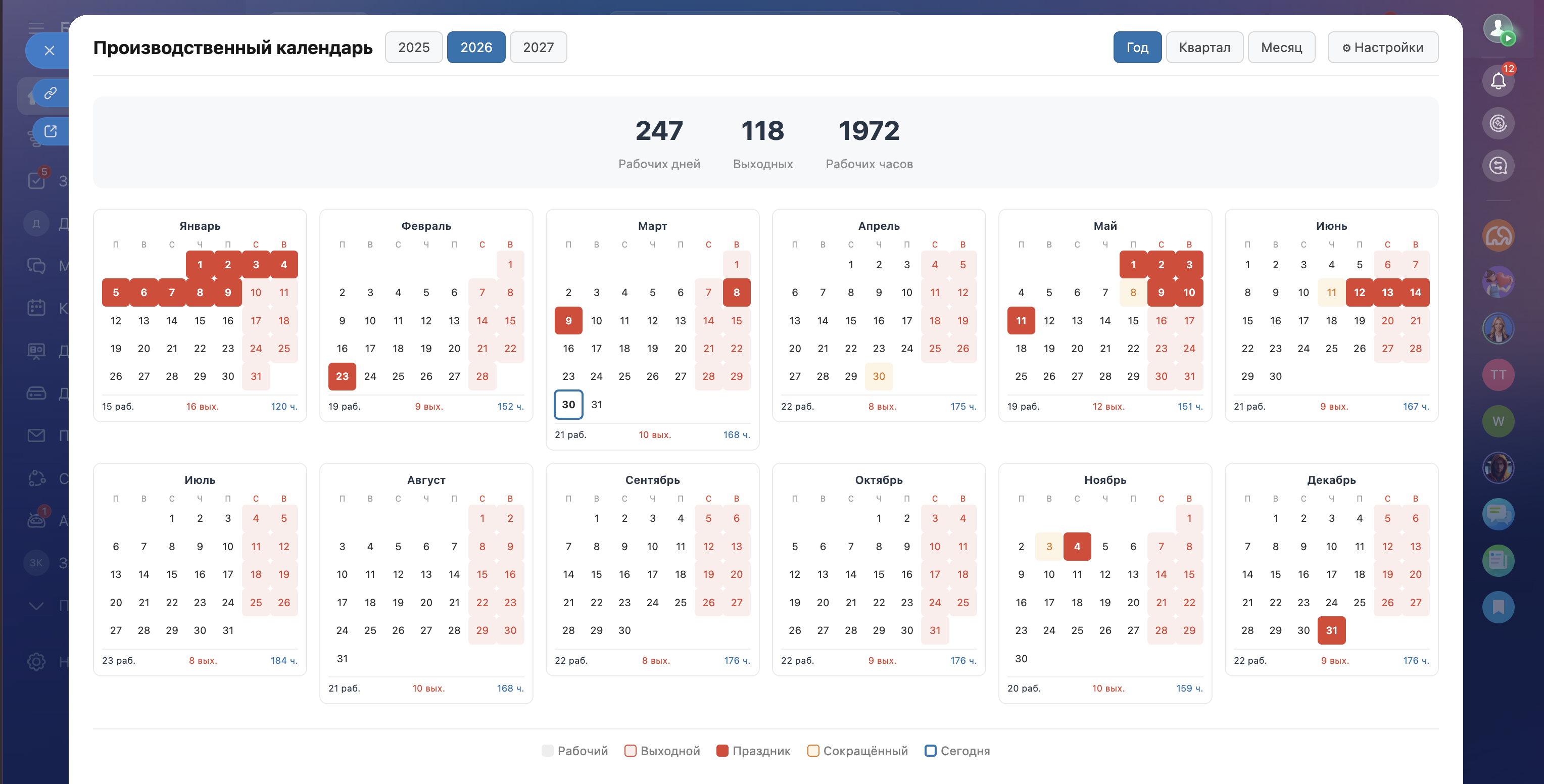 Видя праздничные дни и длинные выходные на одном экране, HR-специалисты могут оптимально планировать отпуска сотрудников и избегать кадровых накладок в пиковые периоды.