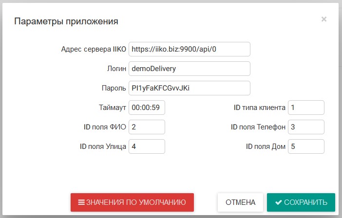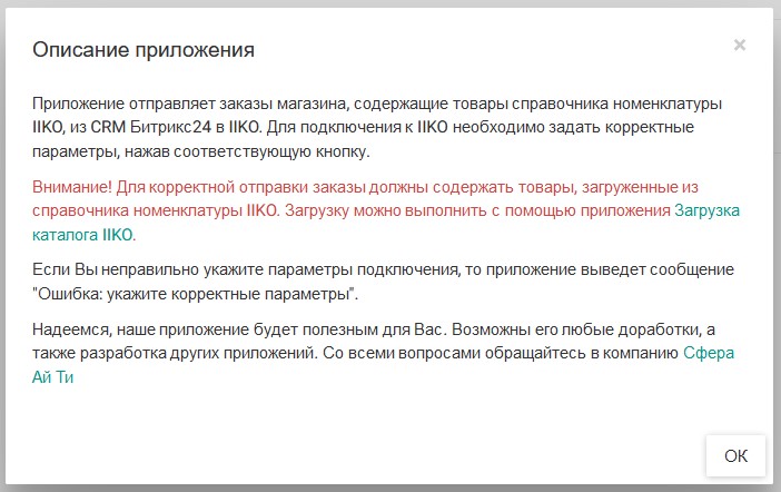 Приложение отправляет заказы магазина, содержащие товары справочника номенклатуры IIKO, из CRM Битрикс24 в IIKO. Для подключения к IIKO необходимо задать корректные параметры, нажав соответствующую кнопку.