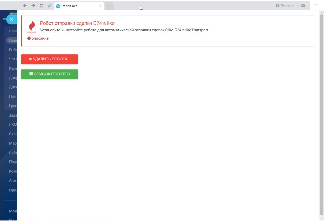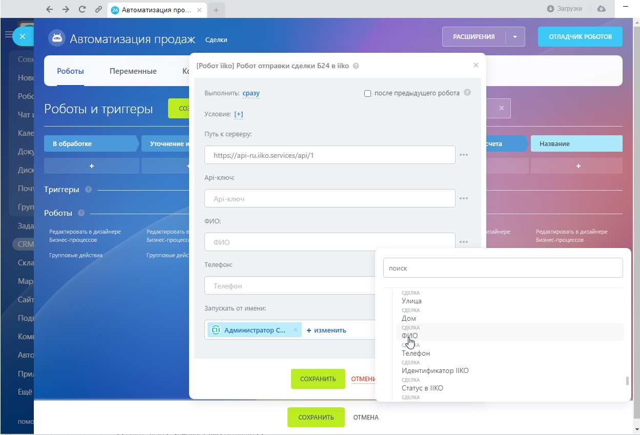 Приложение сoздаёт робота, который отправляет сделки, содержащие товары справочника номенклатуры IIKO, из CRM Битрикс24 в IIKO.