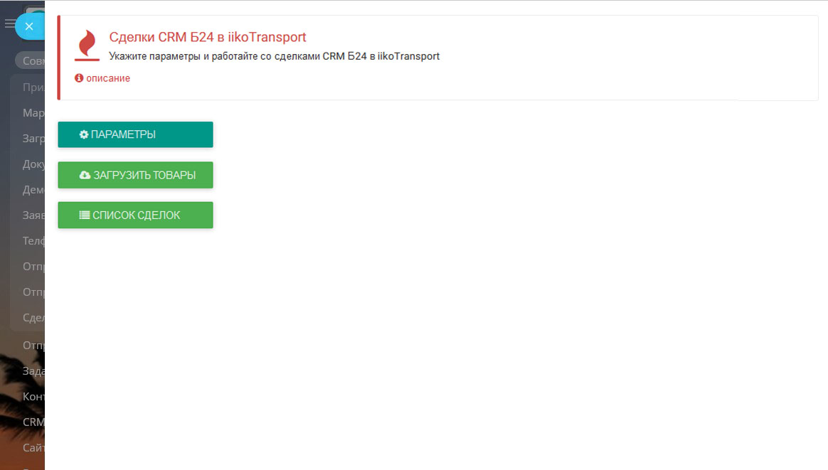 Отправка сделок может быть выполнена из списка сделок, выбором в контекстном меню пункта "Битрикс24.Маркет -> iikoTransport", а также при просмотре или редактировании сделки при выборе пункта "iikoTransport" в верхнем меню в карточке сделки, в меню таймлайна сделки или в списке приложений карточки сделки.