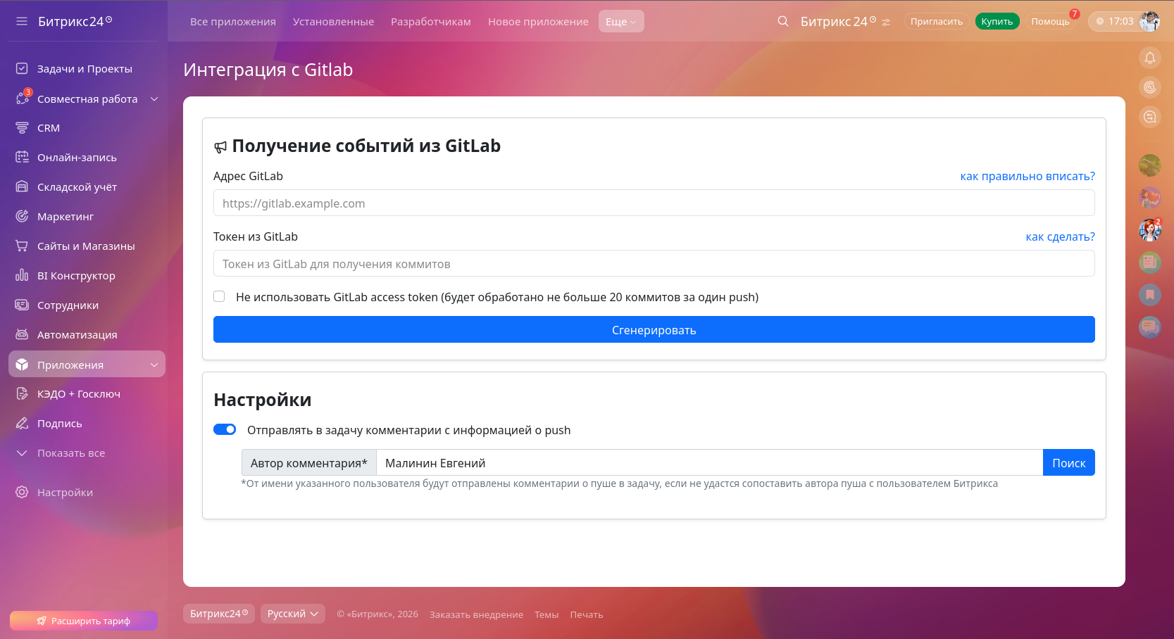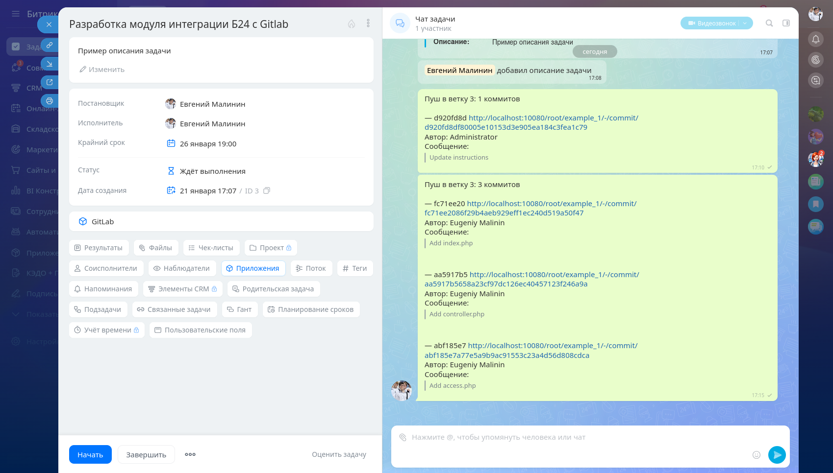 Интеграция с GitLab — это готовое решение для синхронизации GitLab с задачами Битрикс24. Оно автоматически отправляет в карточку задачи подробную информацию о каждом пуше и merge request’е, а также собирает историю коммитов на отдельной вкладке.