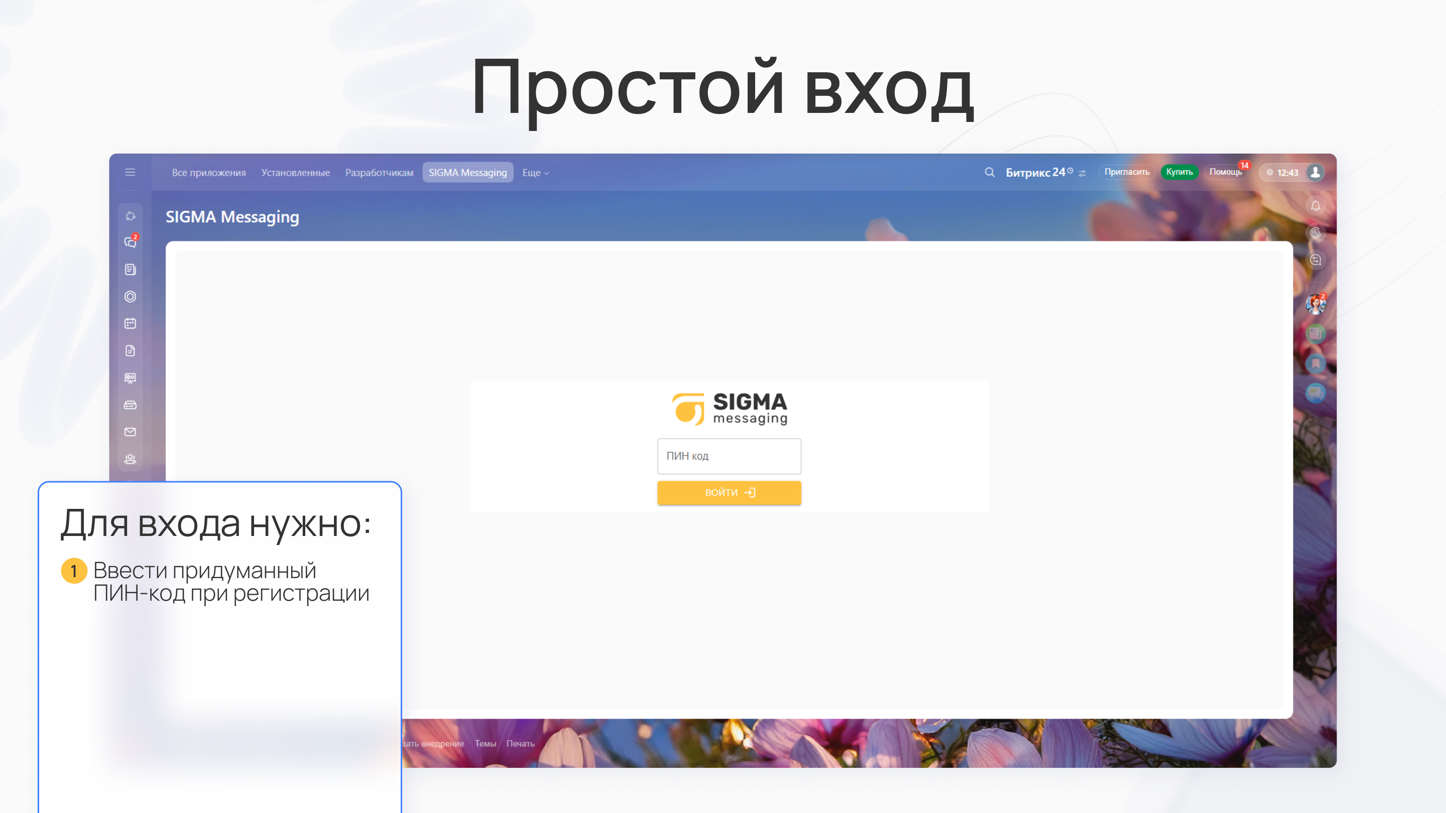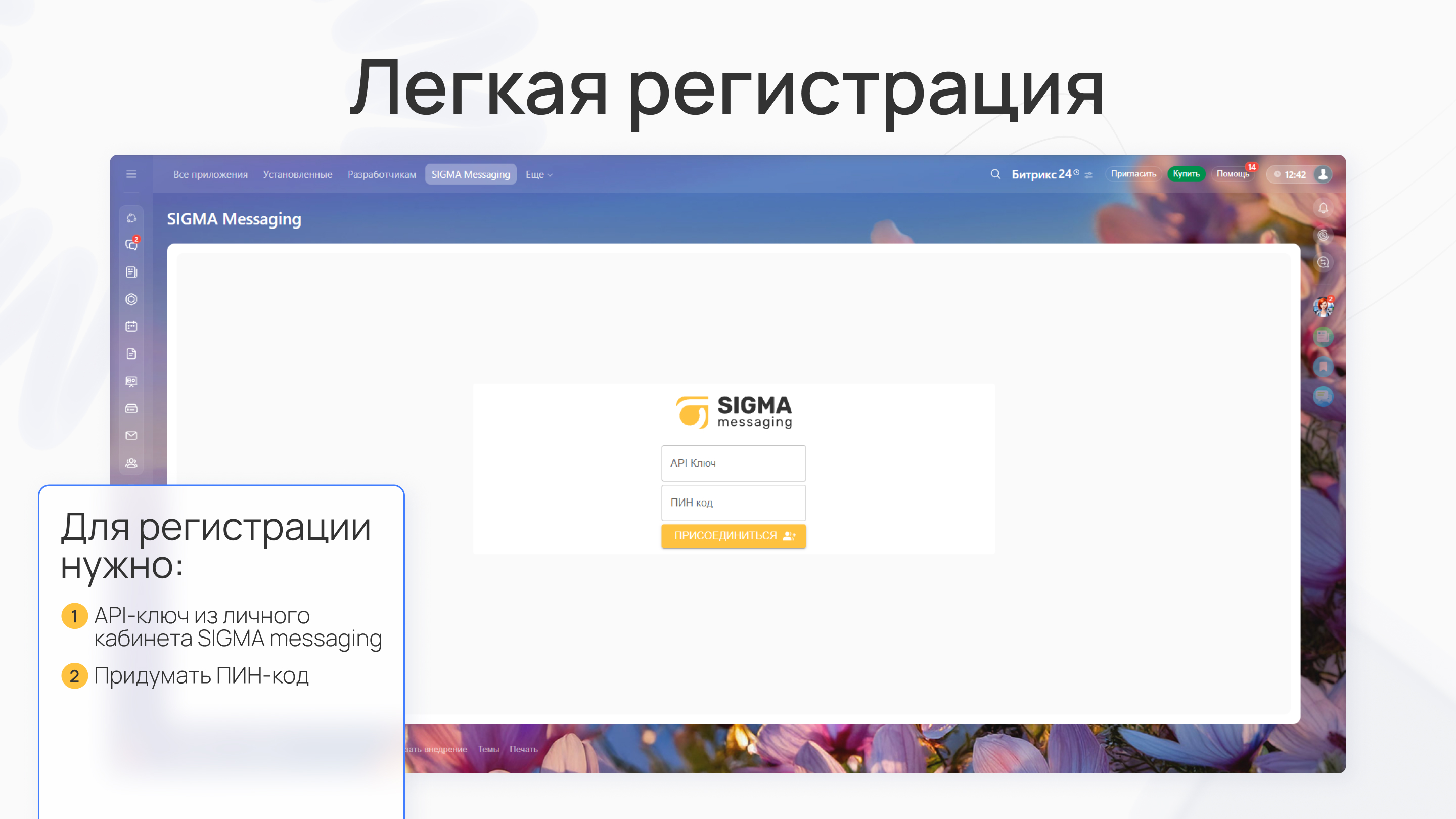 Простая регистрация с помощью API-ключа из личного кабинета SIGMA messaging и ПИН-кода.