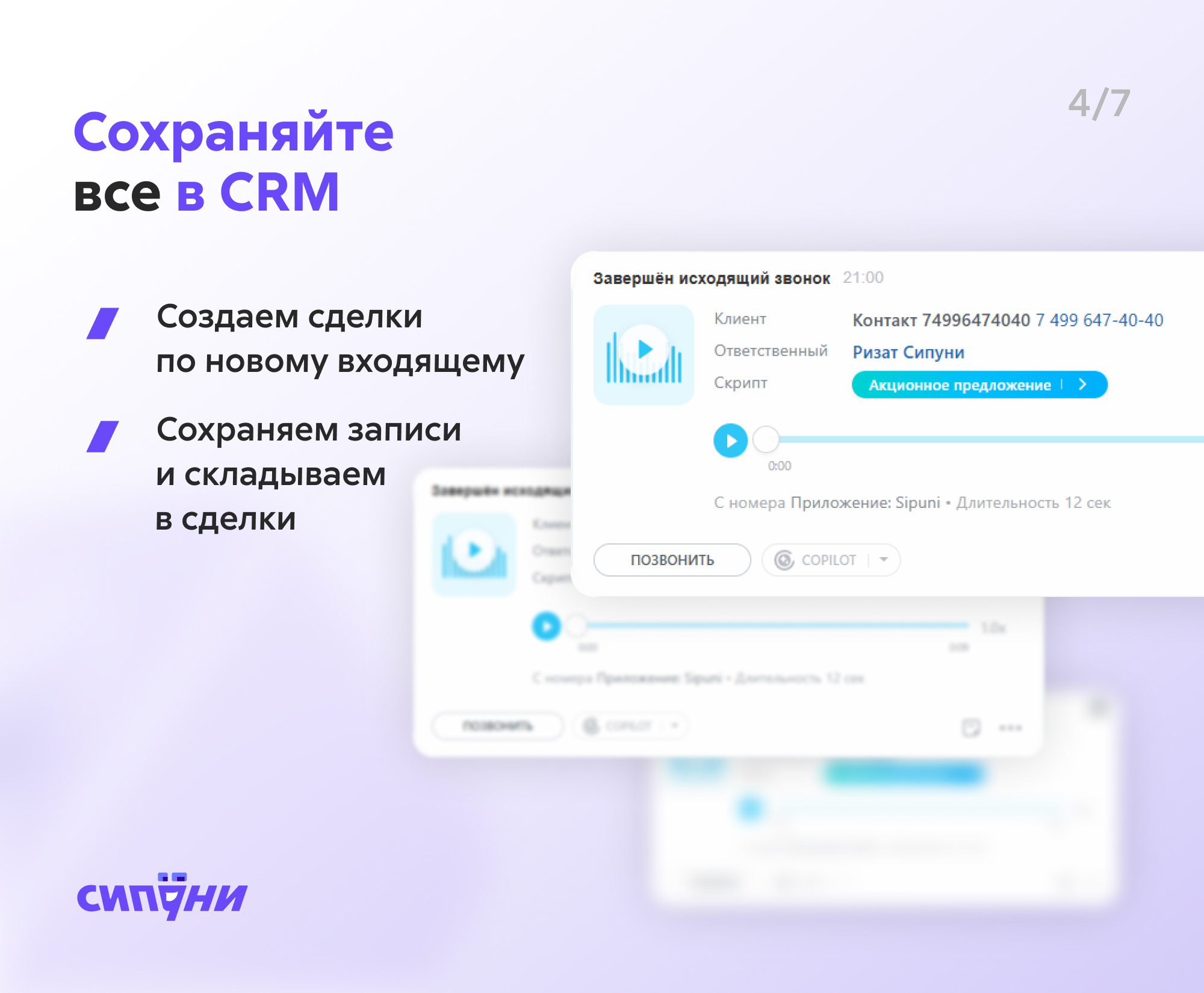 Руководитель сможет прослушать звонки и оценить качество обслуживания. Продавец — переслушать разговор с клиентом, чтобы вспомнить детали сделки.