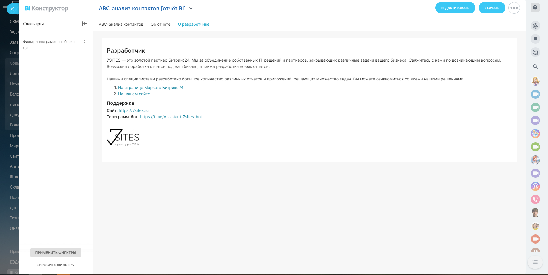 В отчёте используются фильтры, такие как период даты закрытия сделки, ФИО контакта, а также ответственный менеджер, что позволяет более точно анализировать данные и адаптировать стратегию взаимодействия с разными категориями клиентов. Основные показатели представлены в виде круговой диаграммы бубликом, иллюстрирующей долю контактов по категориям, а также числовых данных о сумме сделок. Дополнительно, в отчёте содержатся столбчатые диаграммы с разбивкой по категориям ABC, что наглядно демонстрирует распределение доходов по каждой группе клиентов. ABC-таблица обеспечивает удобный формат для просмотра и анализа всех необходимых данных и показателей.