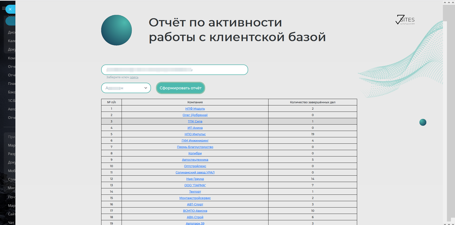 Данное приложение позволяет сформировать отчёт по завершённым делам в разрезе по каждому менеджеру. Это позволяет быстро выявить компании, работу с которыми следует усилить для выполнения плана продаж.