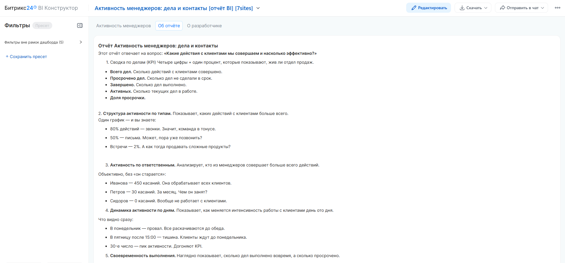 Активность менеджеров: дела, контакты и эффективность.