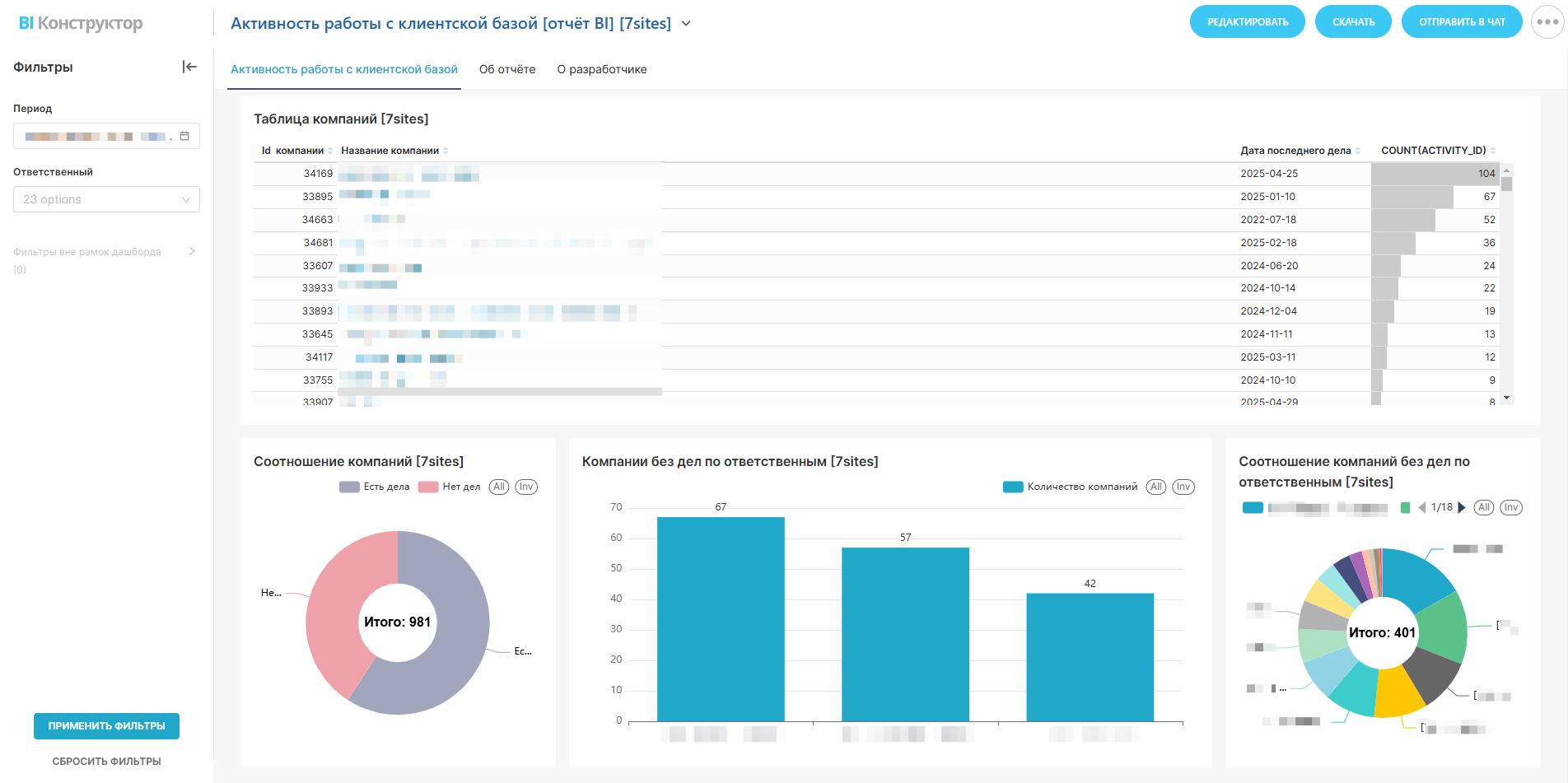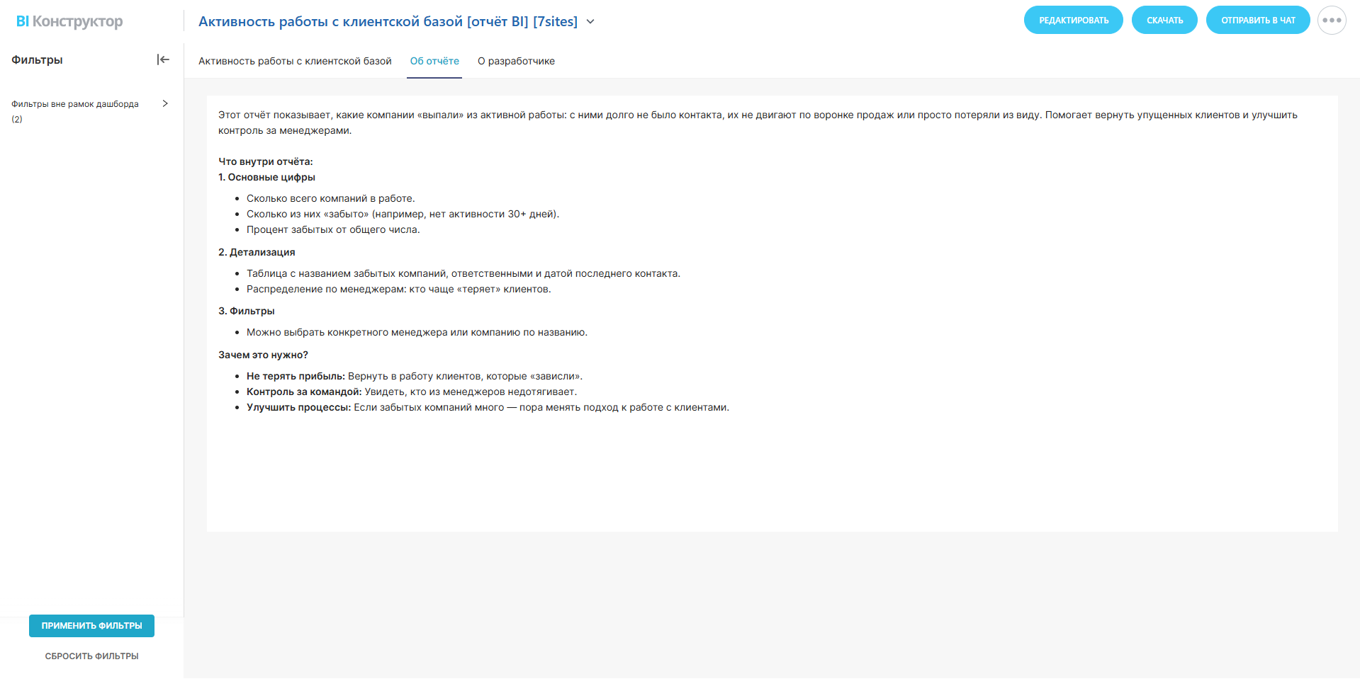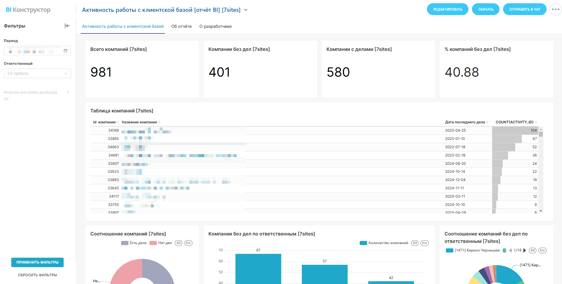 Этот отчёт показывает, какие компании «выпали» из активной работы: с ними долго не было контакта, их не двигают по воронке продаж или просто потеряли из виду. Помогает вернуть упущенных клиентов и улучшить контроль за менеджерами.