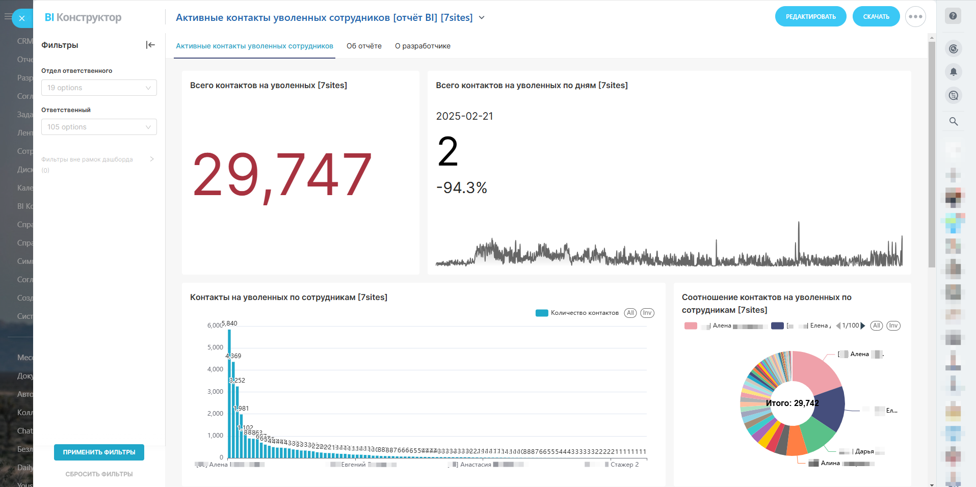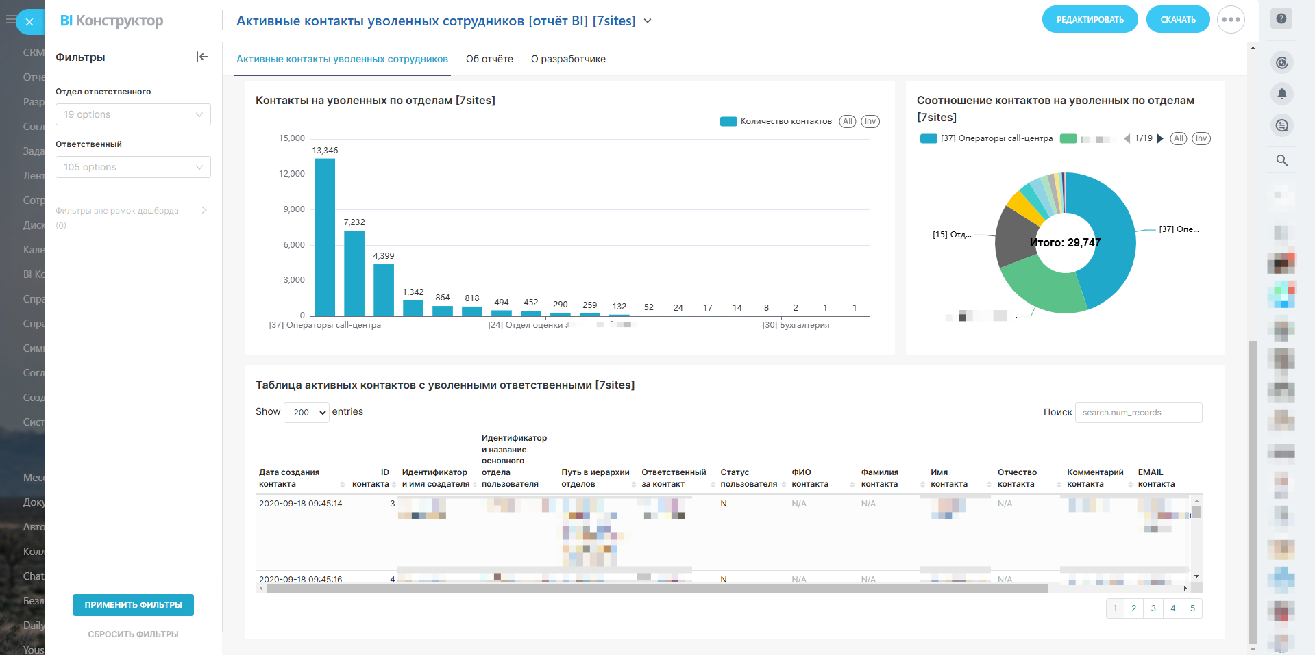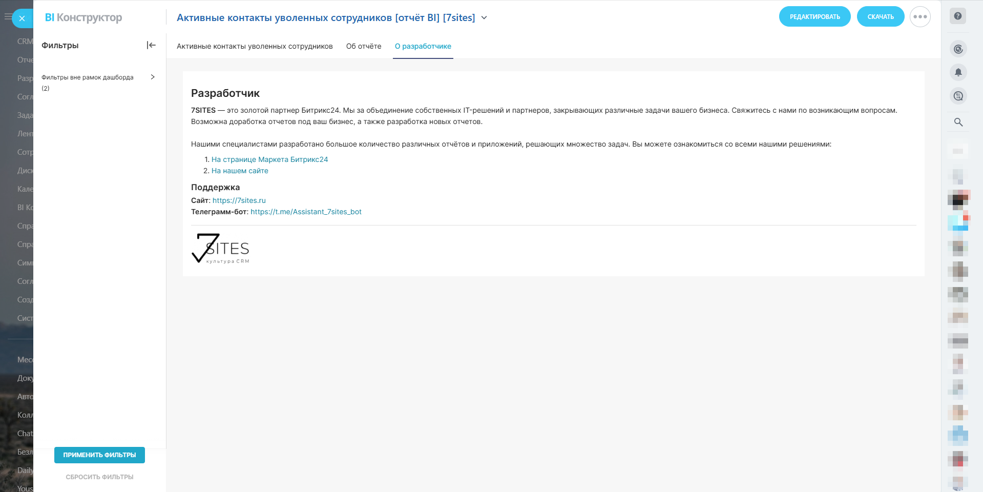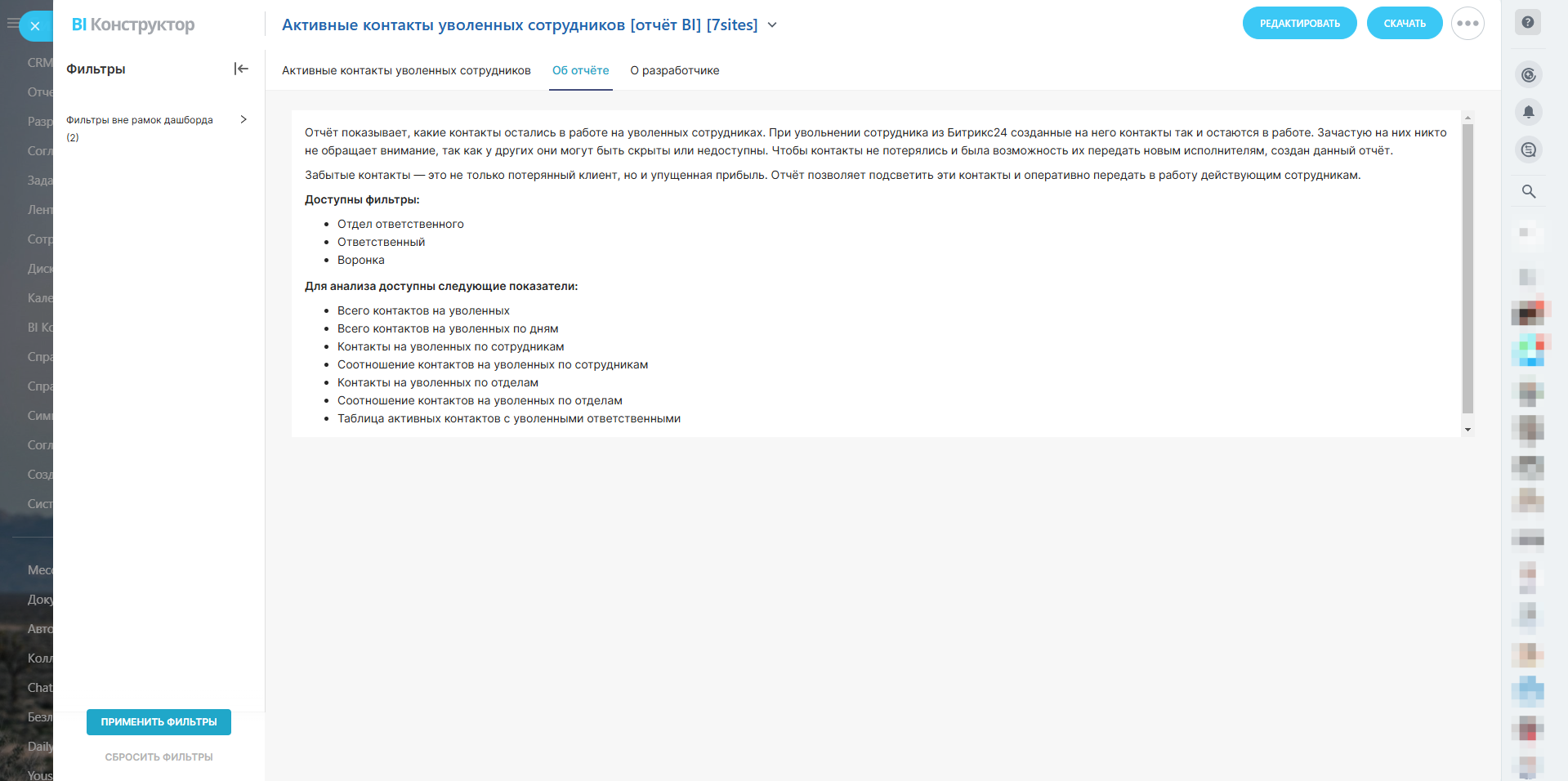 Отчёт показывает, какие контакты остались в работе на уволенных сотрудниках. При увольнении сотрудника из Битрикс24 созданные на него контакты так и остаются в работе. Зачастую на них никто не обращает внимание, так как у других они могут быть скрыты или недоступны. Чтобы контакты не потерялись и была возможность их передать новым исполнителям, создан данный отчёт.