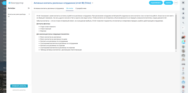 Отчёт показывает, какие контакты остались в работе на уволенных сотрудниках. При увольнении сотрудника из Битрикс24 созданные на него контакты так и остаются в работе. Зачастую на них никто не обращает внимание, так как у других они могут быть скрыты или недоступны. Чтобы контакты не потерялись и была возможность их передать новым исполнителям, создан данный отчёт.