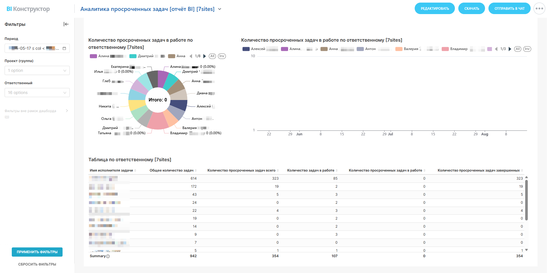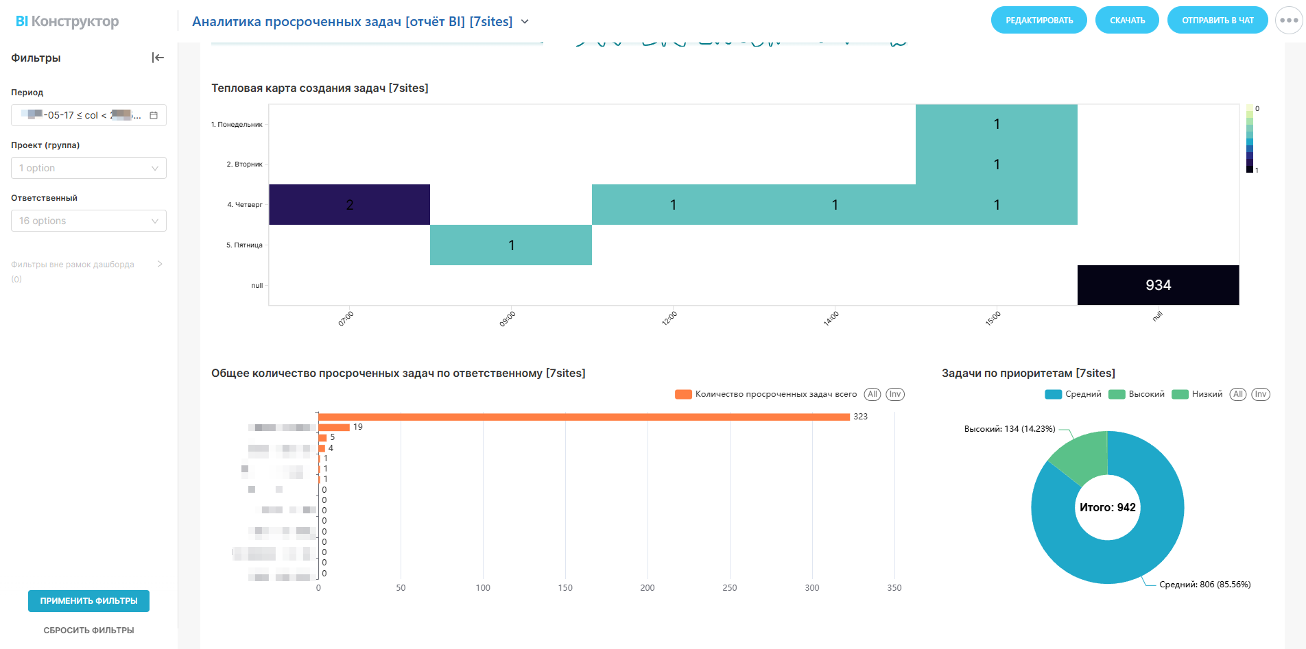 Общее количество просроченных задач по ответственному:- Помогает определить, кто из сотрудников или команд испытывает наибольшую нагрузку или имеет проблемы с выполнением задач. Это может быть использовано для предоставления дополнительной поддержки.