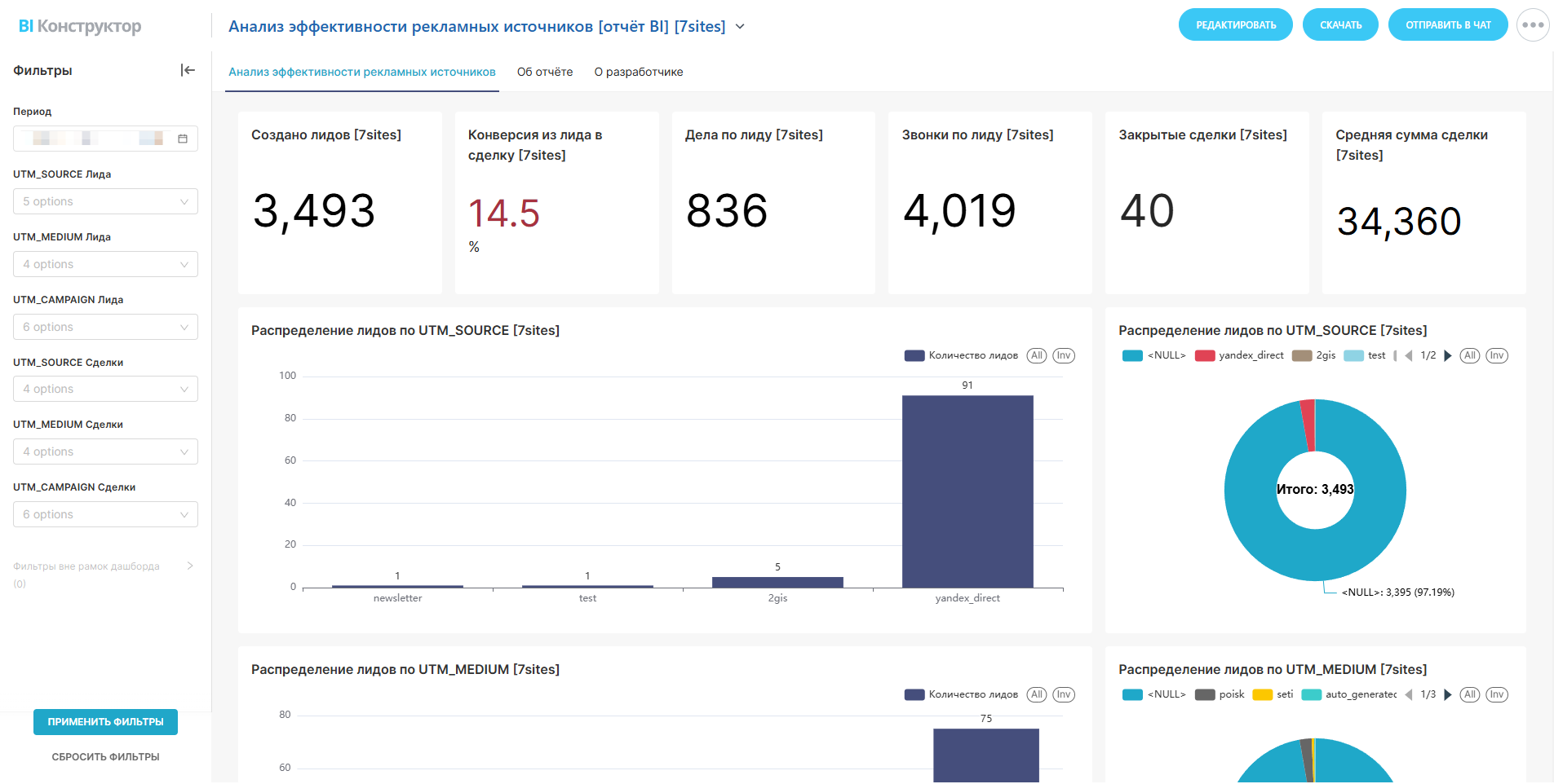 Анализ ROI рекламных источников: конверсия лидов в сделки, средний чек и активность менеджеров по UTM-меткам. Позволяет оптимизировать рекламный бюджет и повысить прибыльность каналов.