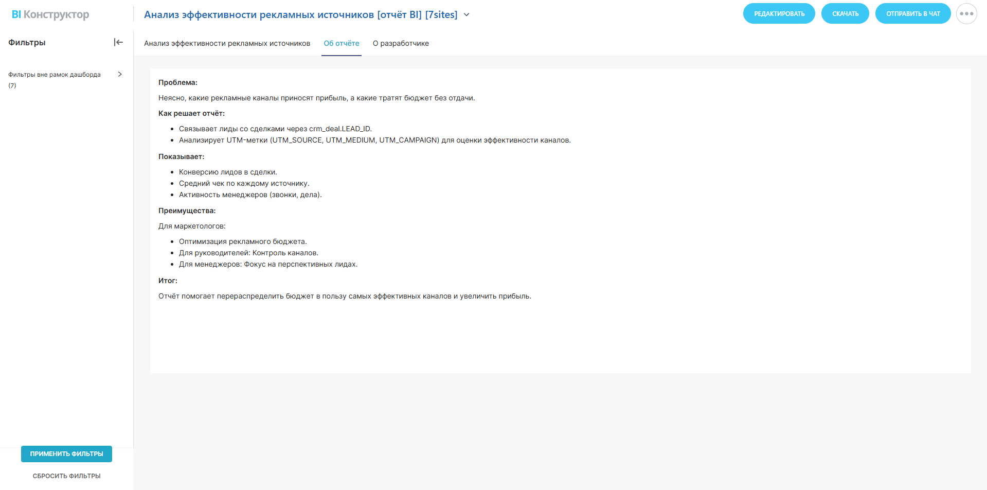 Отчёт помогает перераспределить бюджет в пользу самых эффективных каналов и увеличить прибыль.