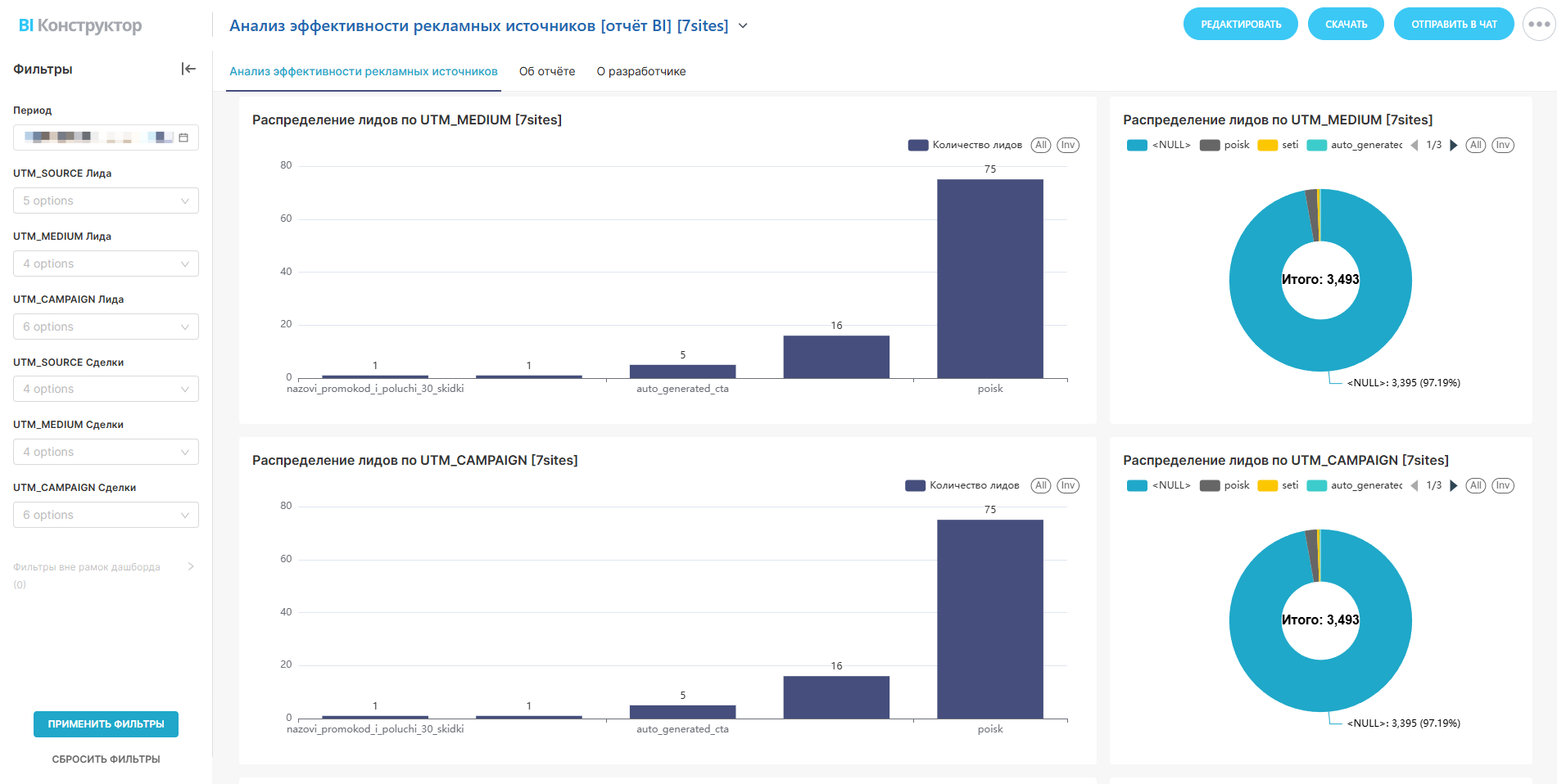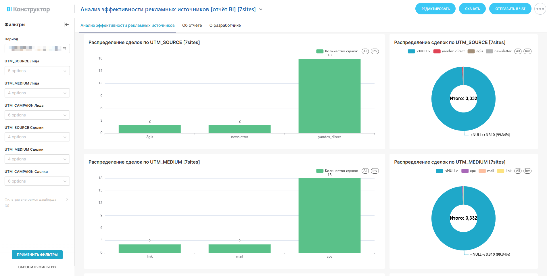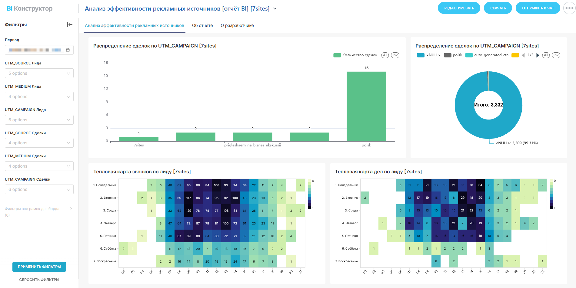 - Анализирует UTM-метки (UTM_SOURCE, UTM_MEDIUM, UTM_CAMPAIGN) для оценки эффективности каналов.