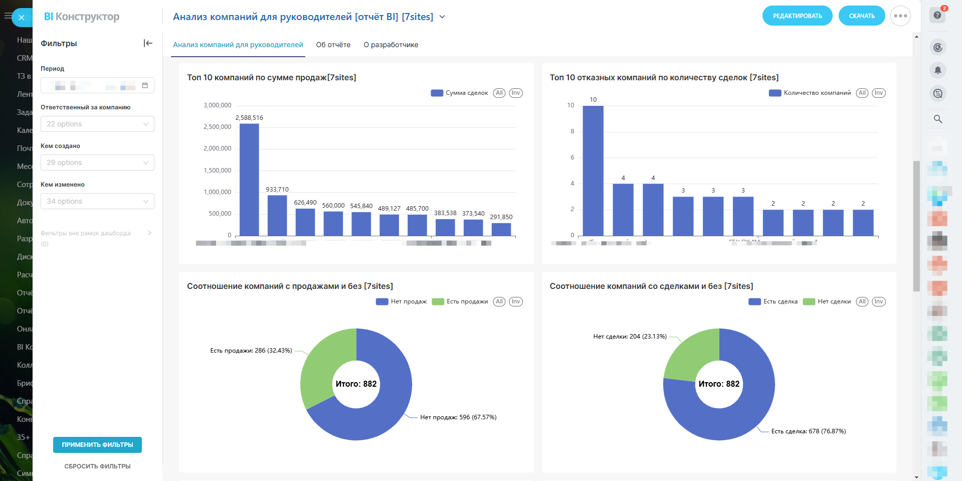 Отчёт предоставляет руководителям комплексный инструмент для анализа работы с компаниями в Битрикс24, фокусируясь на их динамике, эффективности взаимодействия и финансовых результатах.