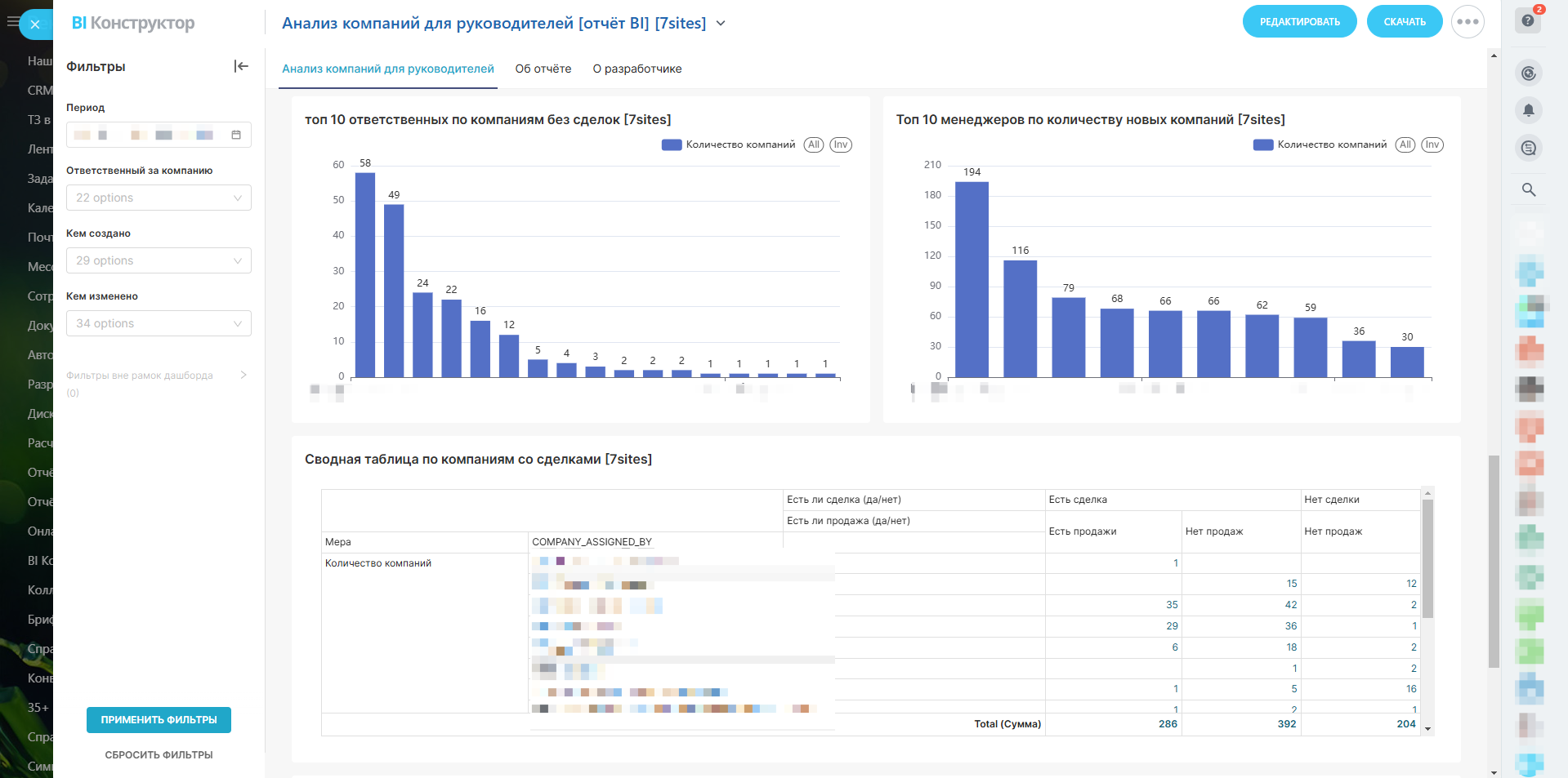 Топ-листы: Выделение самых прибыльных и проблемных компаний, а также менеджеров по результативности (новые компании, компании без сделок).