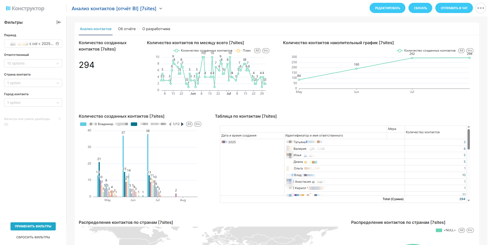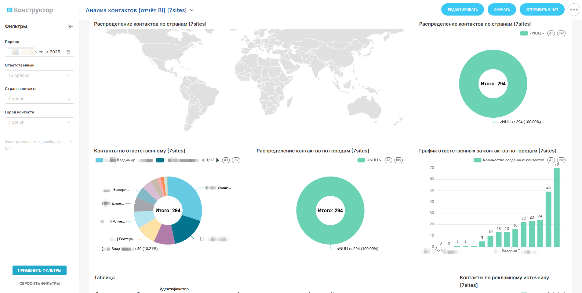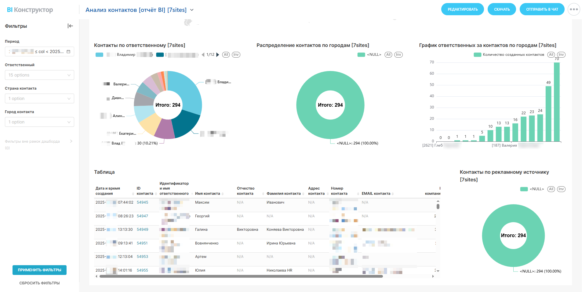 График ответственных за контакты по городам: Визуализация, показывающая, какие сотрудники работают с контактами в каждом городе. Помогает определить территориальное распределение ответственности.