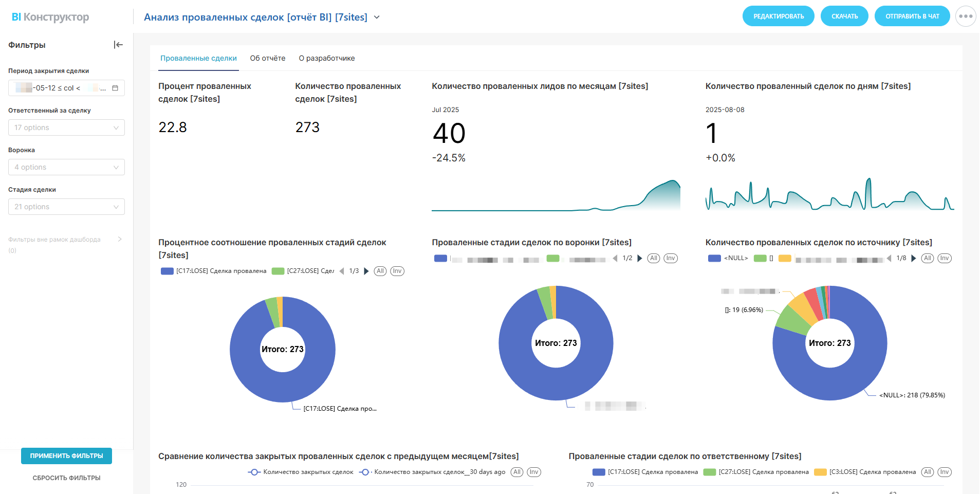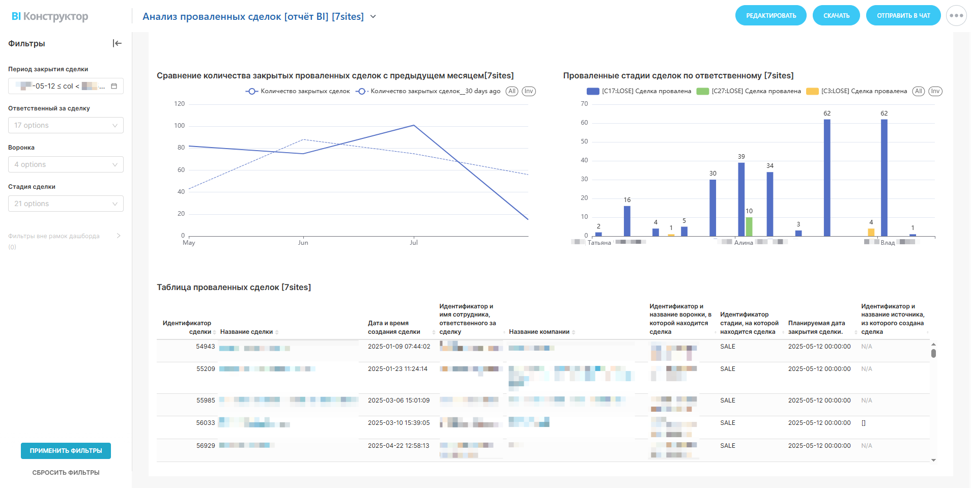 Проваленные стадии сделок по ответственному - Анализ проваленных сделок по ответственным сотрудникам выявляет, кто из членов команды нуждается в дополнительной поддержке и обучении. Это позволяет создать более эффективную и сбалансированную команду продаж.
