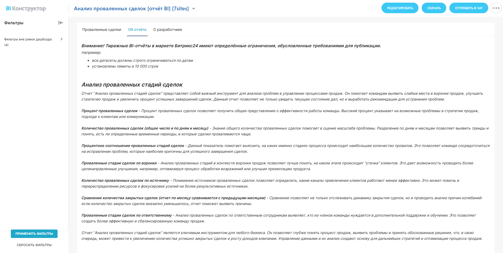 Отчет "Анализ проваленных стадий сделок" представляет собой важный инструмент для анализа проблем в управлении процессами продаж. Он помогает командам выявить слабые места в воронке продаж, улучшить стратегию продаж и увеличить процент успешных завершений сделок. Данный отчет позволяет не только увидеть текущее состояние дел, но и выработать рекомендации для устранения проблем.