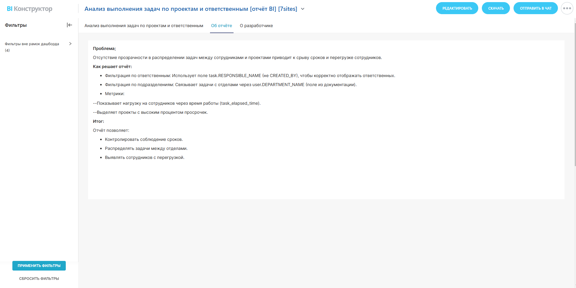 Отчёт позволяет контролировать соблюдение сроков, распределять задачи между отделами, выявлять сотрудников с перегрузкой.